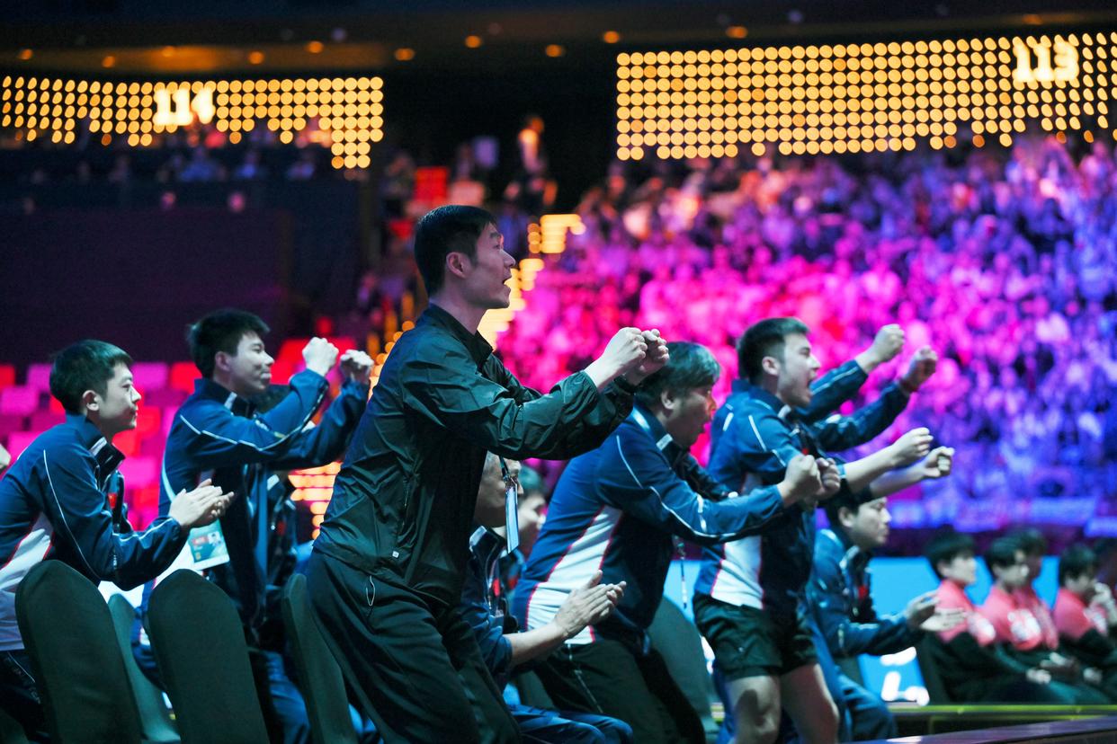 4月5日,中国乒协主席王励勤(中)和其他中国队成员为王楚钦加油。新华社发(张金加摄)