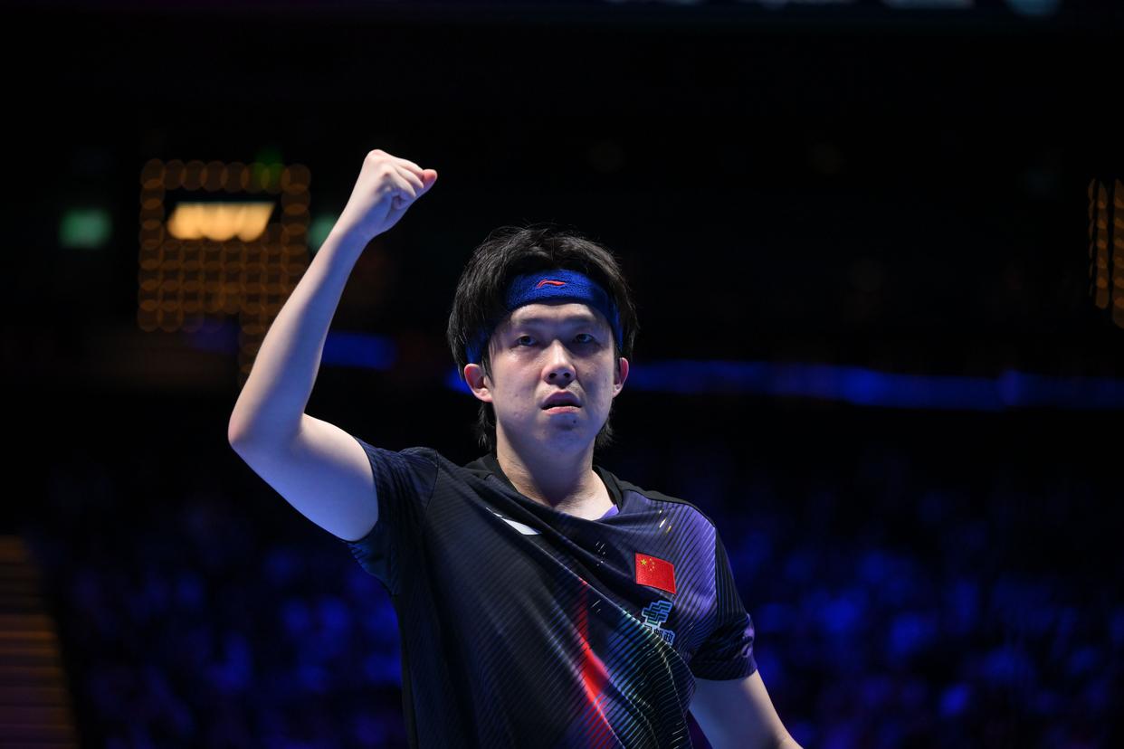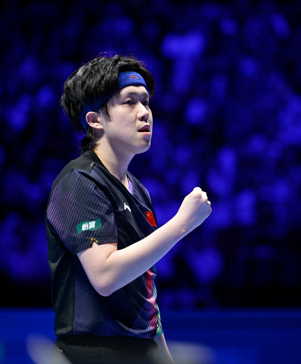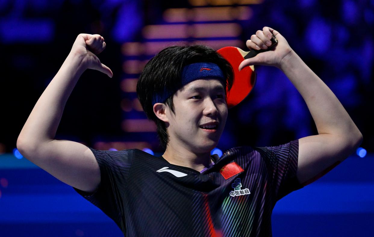 4月5日,中国选手王楚钦在赛后庆祝胜利。新华社发(张金加摄)