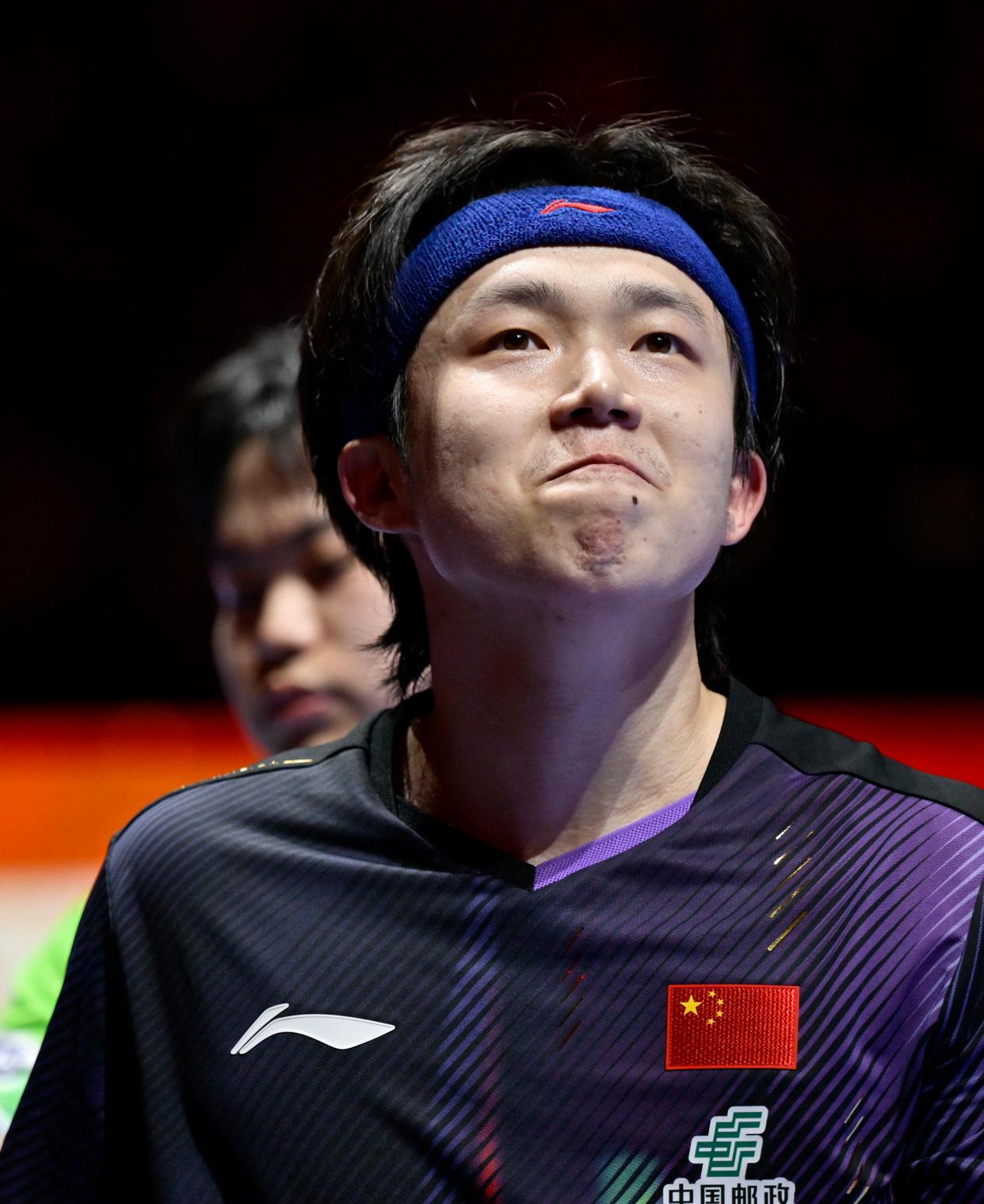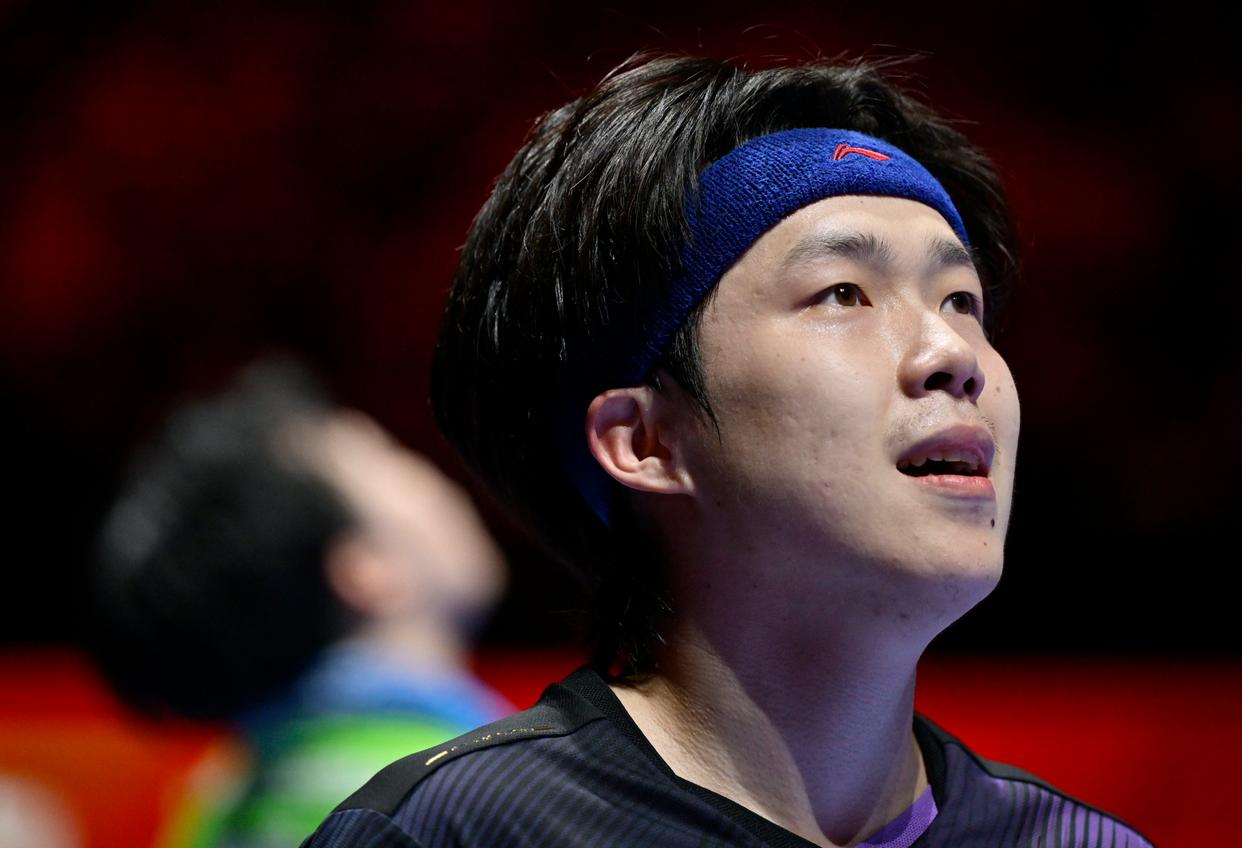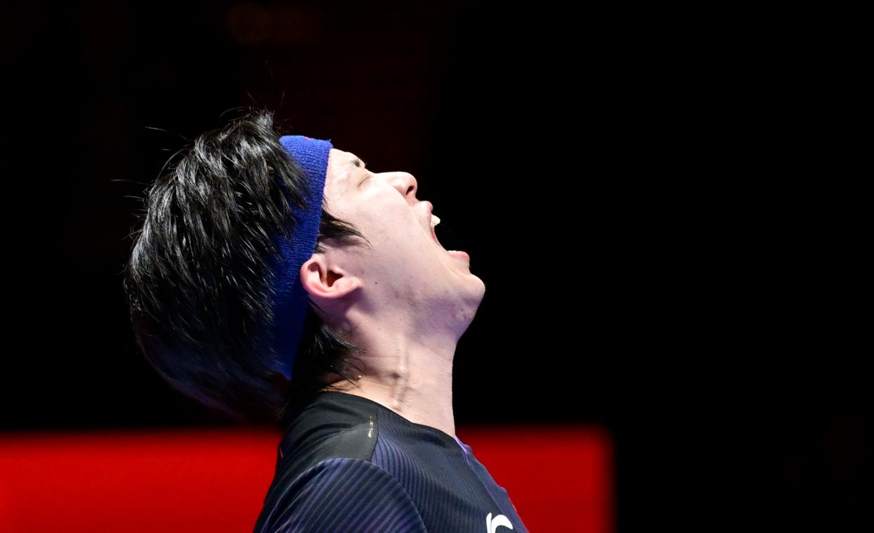 4月5日,日本选手松岛辉空在比赛中失分后。新华社记者 于洋 摄