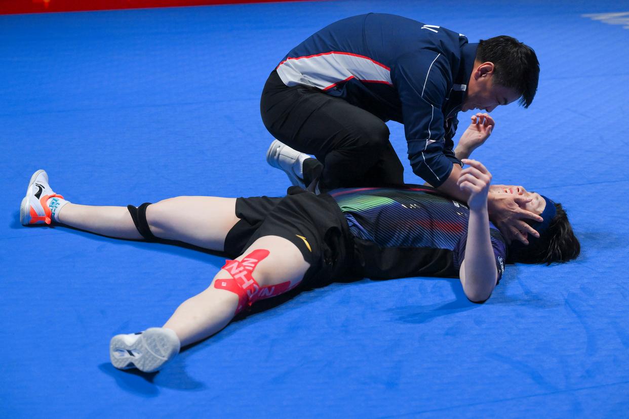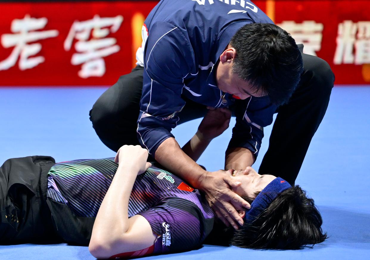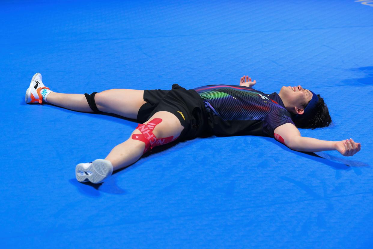 4月5日,日本选手松岛辉空在比赛中失分后。新华社记者 于洋 摄