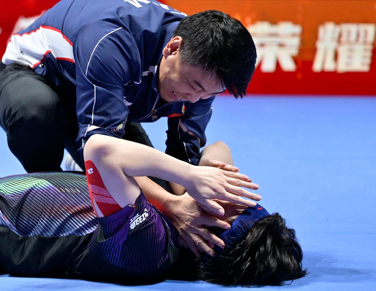 4月5日,中国选手王楚钦(下)在赛后与教练王皓庆祝胜利。新华社发(张金加摄)