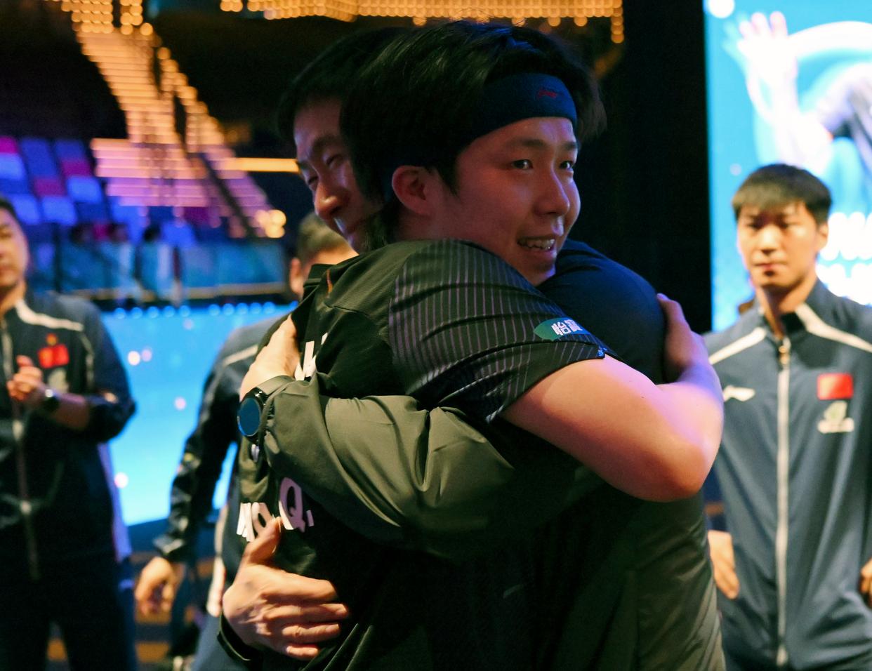4月5日,王楚钦夺冠后和中国乒协主席王励勤拥抱。新华社发(张金加摄)