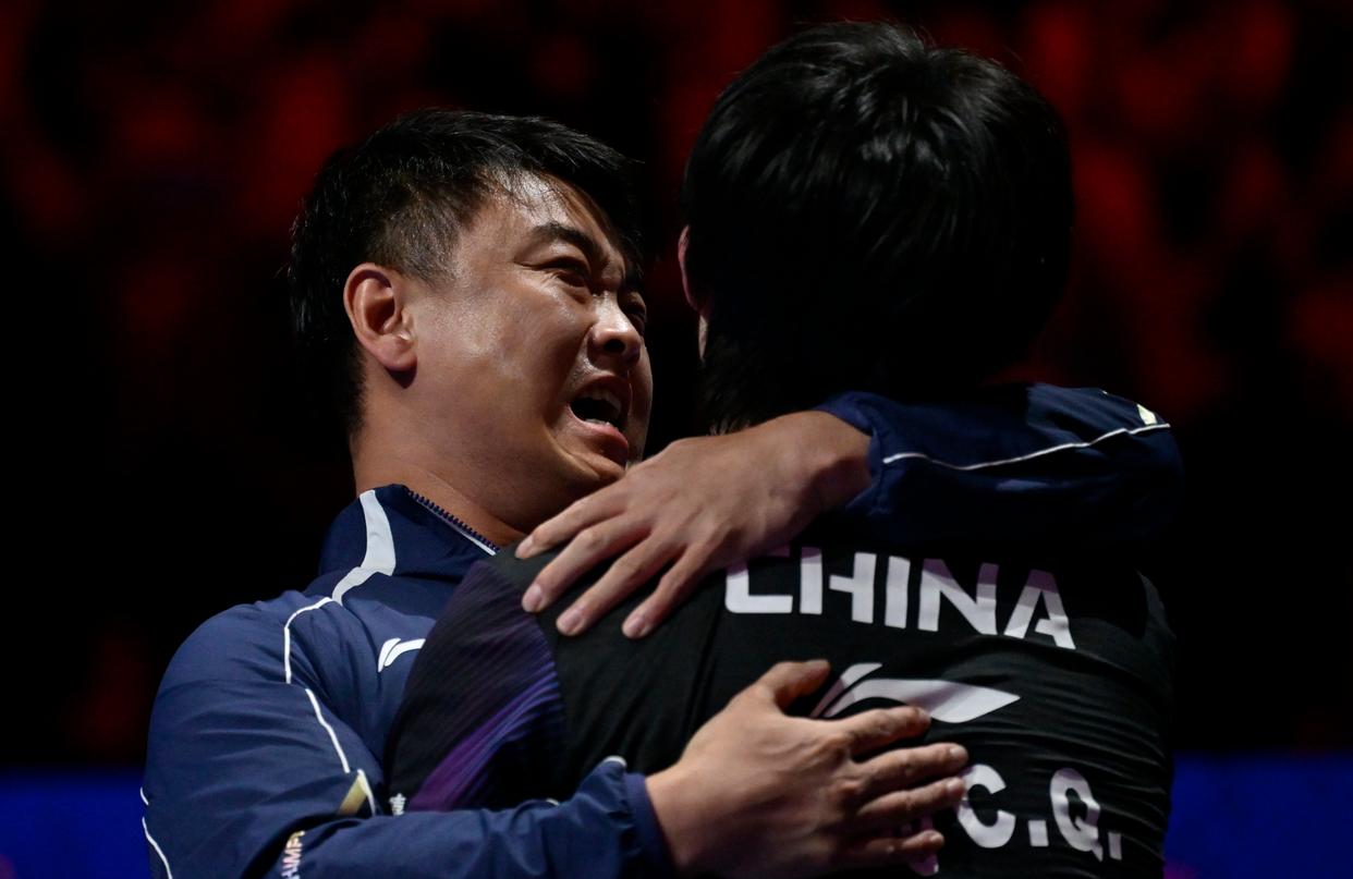 4月5日,中国选手王楚钦(下)在赛后与教练王皓庆祝胜利。新华社记者 于洋 摄