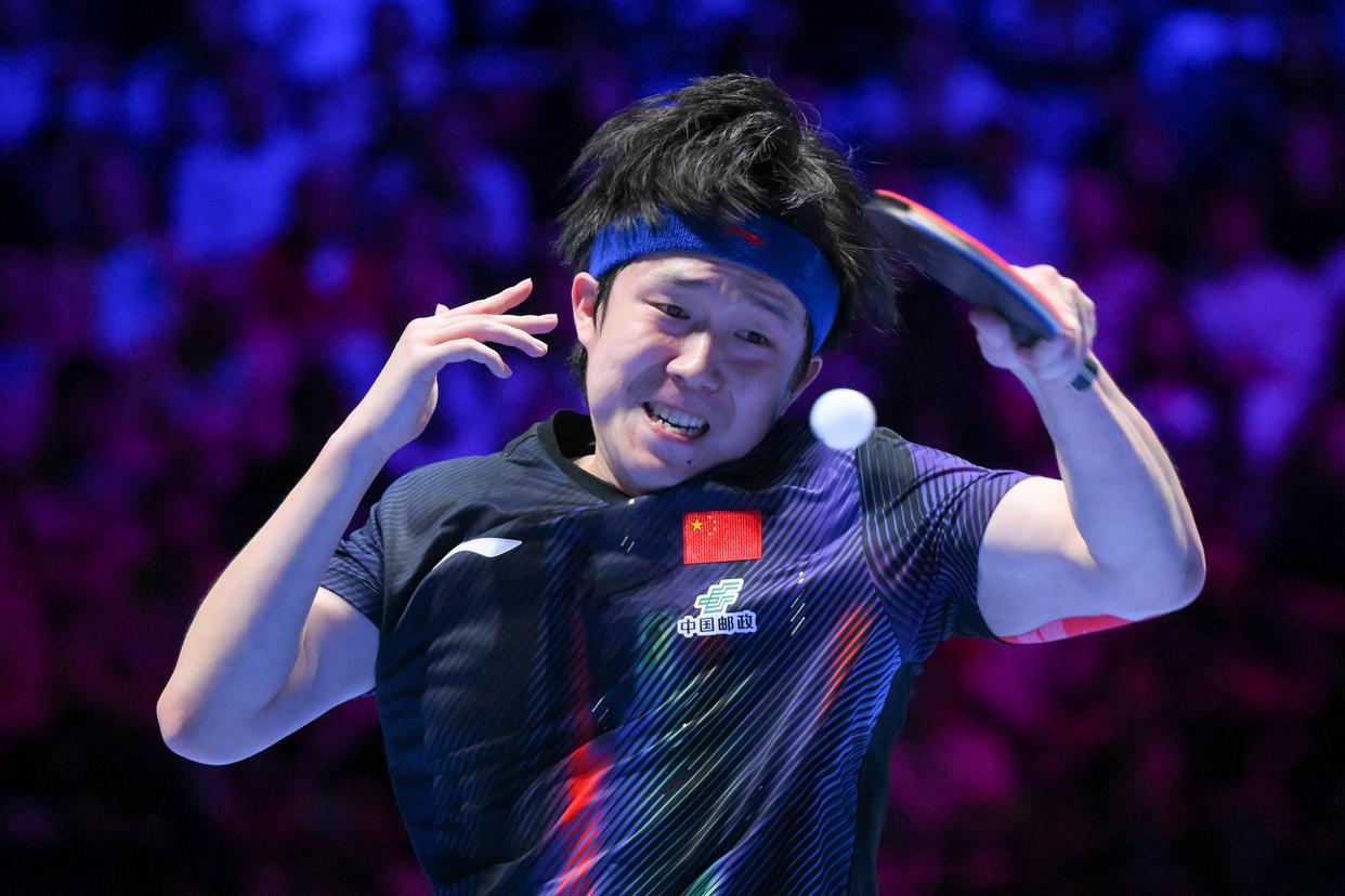 4月5日,中国选手王楚钦在比赛中回球。新华社发(张金加摄)