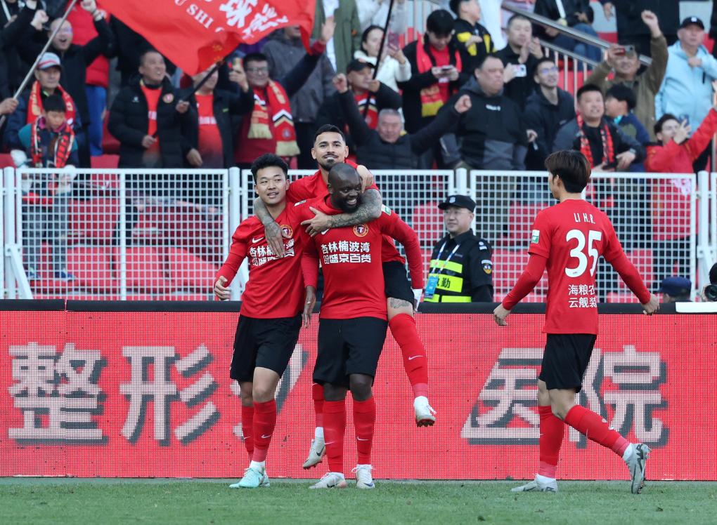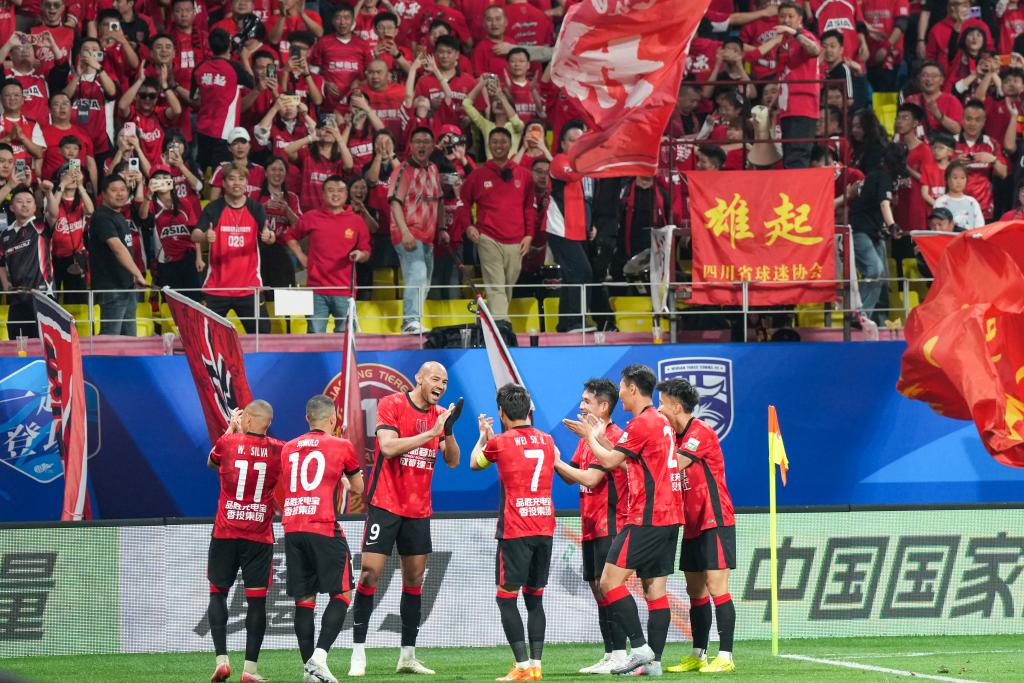 4月3日,成都蓉城队球员费利佩(左三)在进球后与队友庆祝。新华社记者 王曦 摄