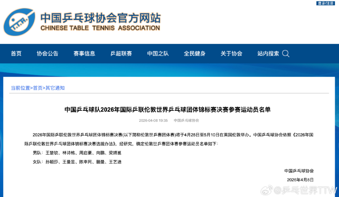 今天,中国乒协在官网公布了2026年国际乒联伦敦世界乒乓球团体锦标赛决赛参赛运动员名单。中国乒乓球协会依照《2026年国际乒联伦敦世界乒乓球团体锦标赛决赛选拔办法》,确定伦敦世乒赛团体赛参赛运动员名单如下: