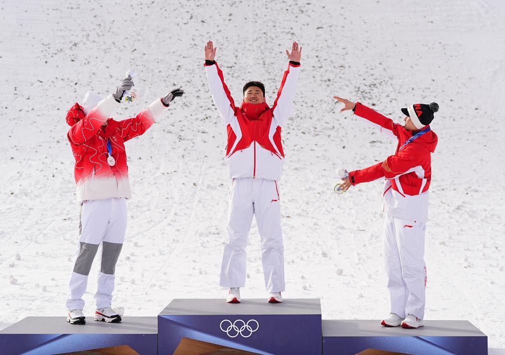 2月20日,冠军中国选手王心迪(中)在米兰-科尔蒂纳冬奥会自由式滑雪男子空中技巧颁奖仪式上庆祝。新华社记者 邬惠我 摄