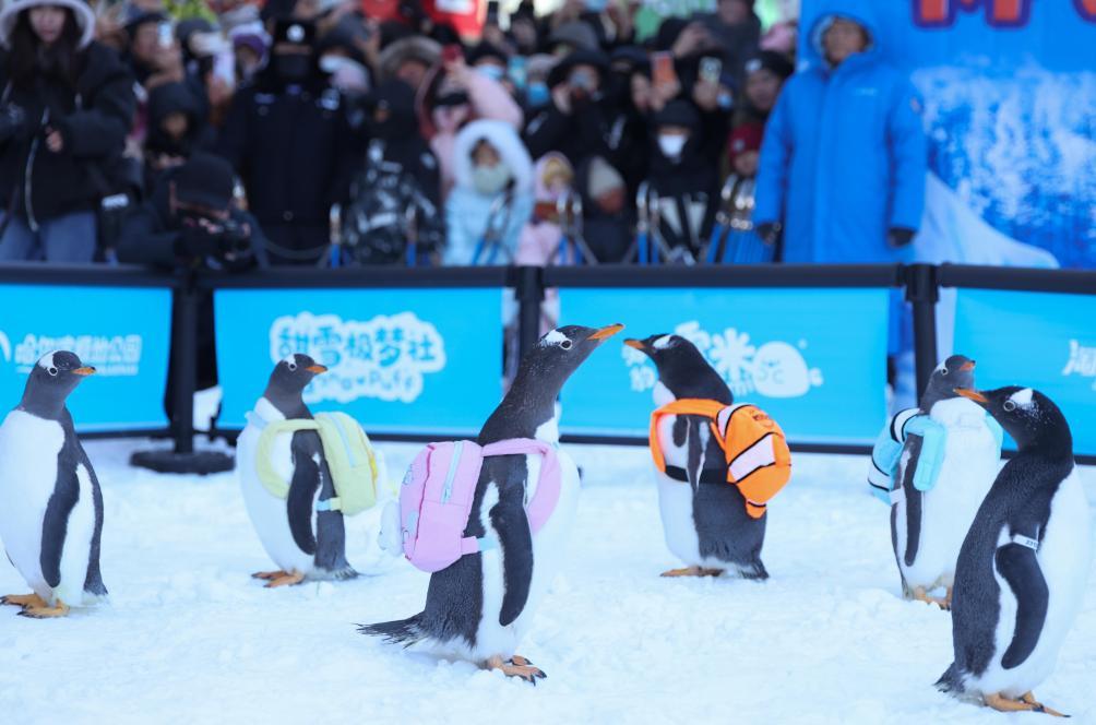来自哈尔滨极地公园的“淘学企鹅”来到了“林都”黑龙江省伊春市巡游,吸引众多市民和游客前来观赏。新华社发(李佳星 摄)