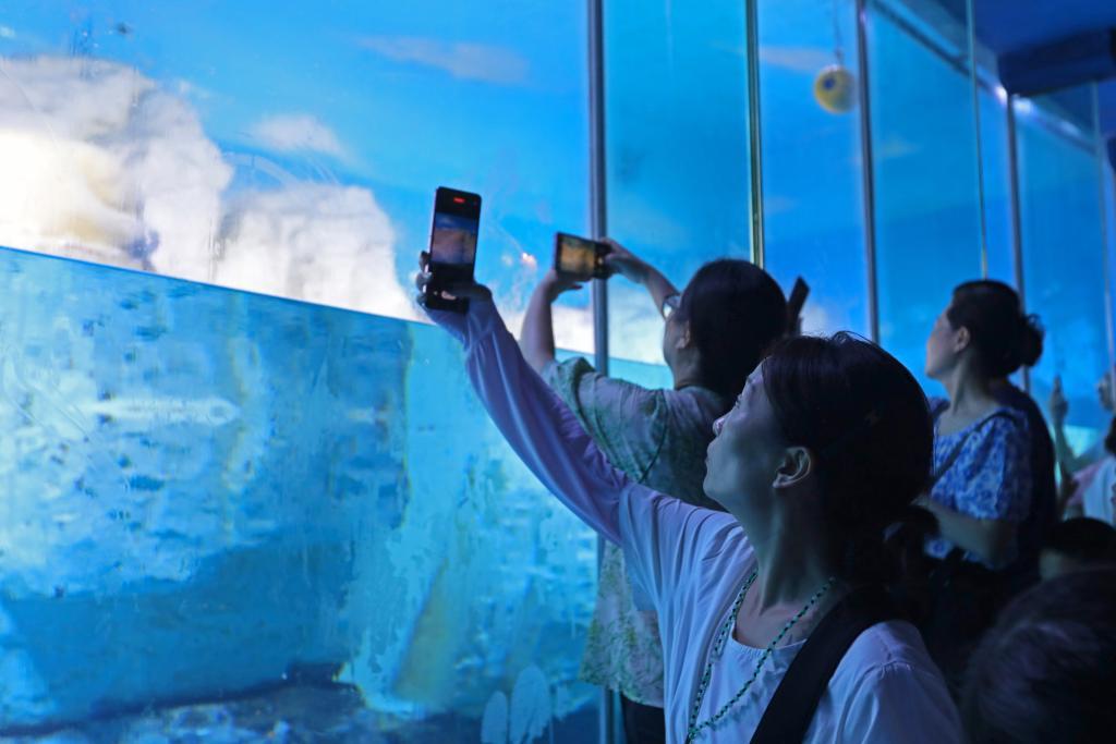 游客在大连老虎滩海洋公园的极地馆内拍照。新华社记者 陈为 摄