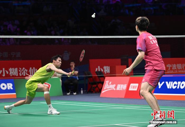 4月9日,2026亚洲羽毛球锦标赛在浙江宁波举行,中国香港选手李卓耀(左)0比2不敌中国选手石宇奇(右)。 中新社记者 王刚 摄