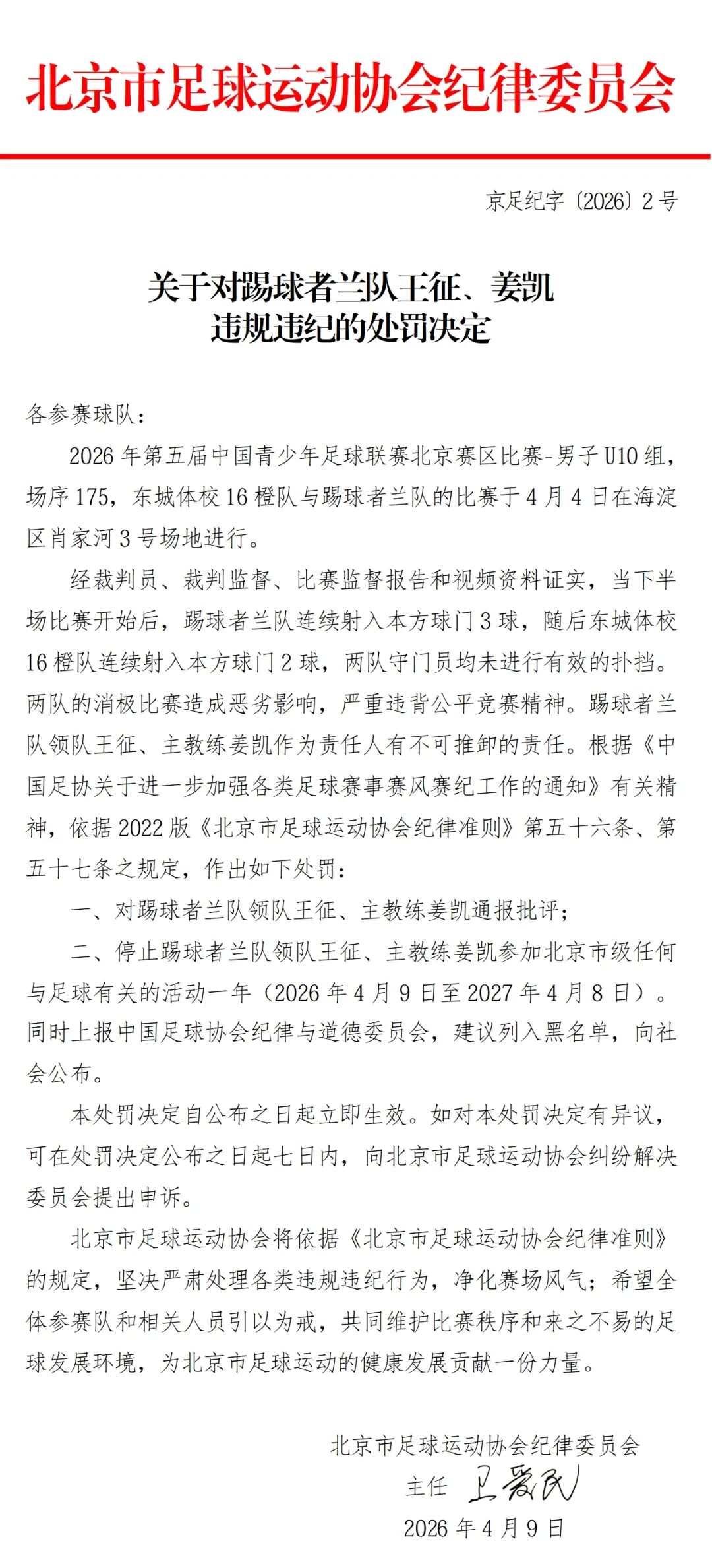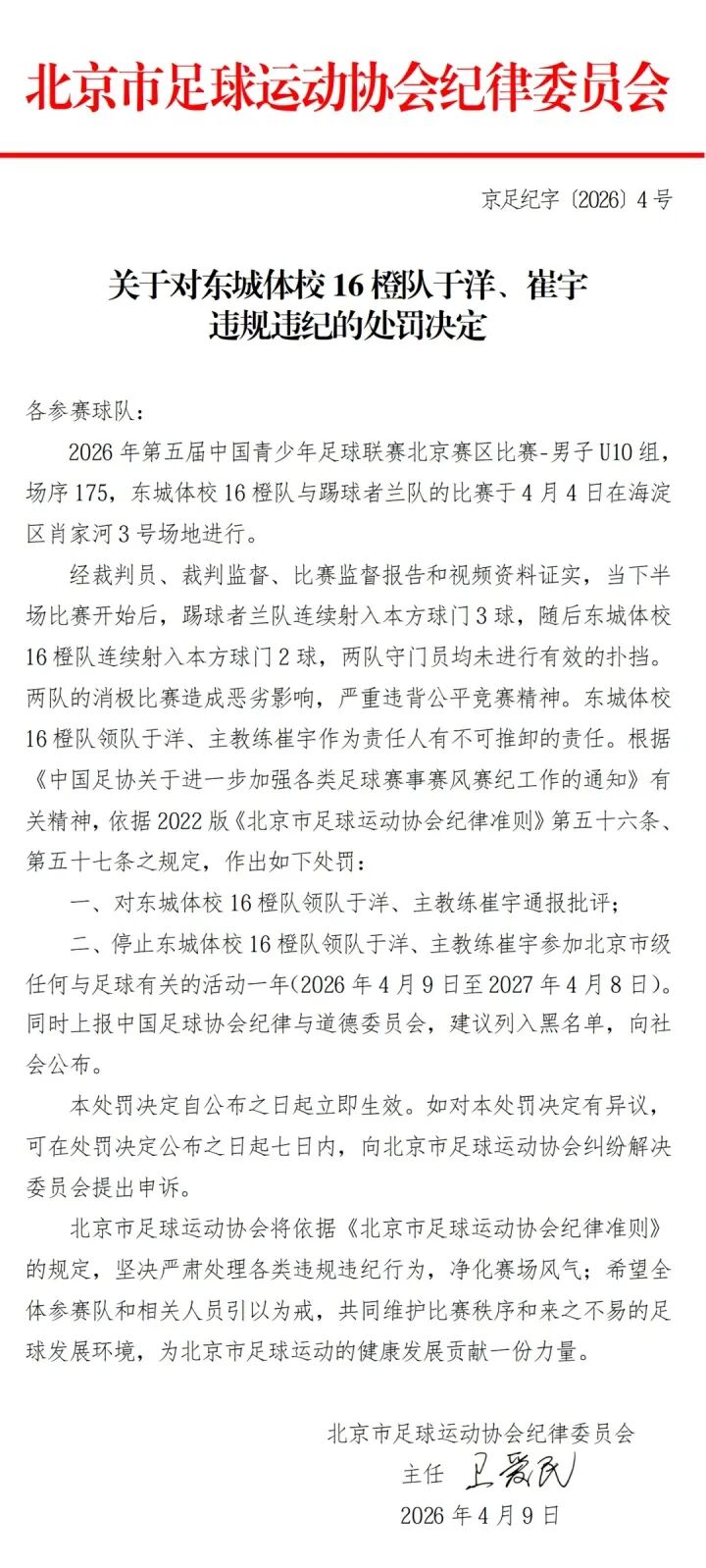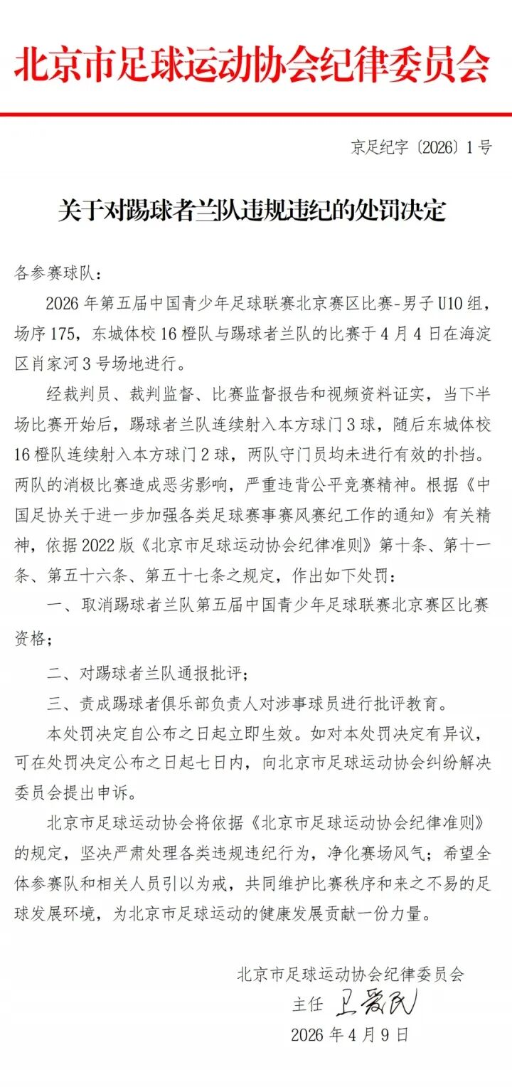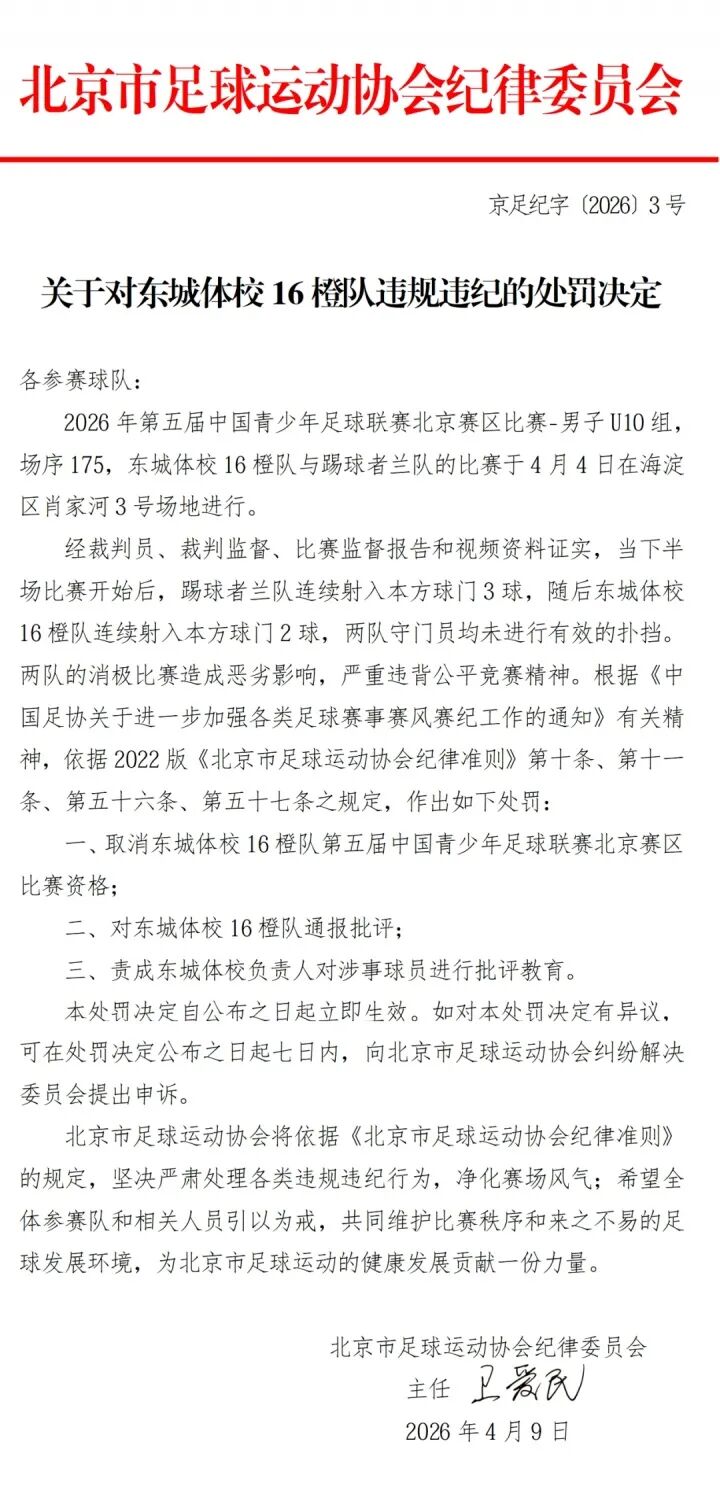 北京时间4月9日,北京足协连发四条处罚决定,对中青赛北京赛区U10组东城体校16橙队和踢球者兰队在比赛中互射本方球门的行为处以取消赛事资格,两队领队及主教练均被禁赛一年。