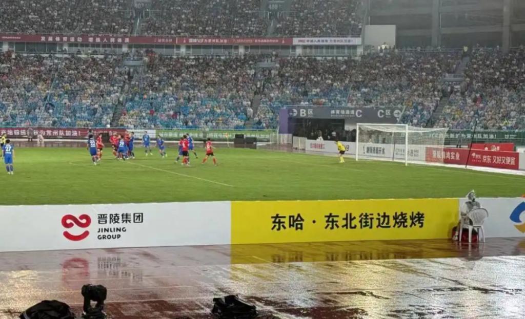“东哈·东北街边烧烤”早早报名赞助常州队场边广告,“苏超”火爆后它依然与大牌企业一起出现在常州队主场比赛现场