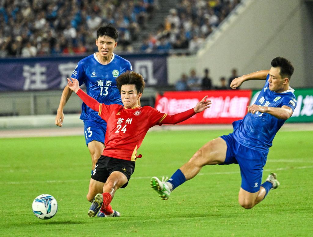 18岁的苏州队队员寇程(中)打进2025赛季“苏超”最快进球,成为“苏超”年轻球员的代表。新华社记者 季春鹏 摄