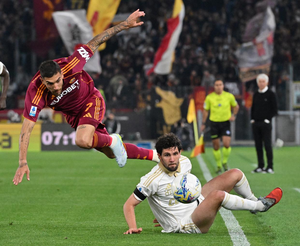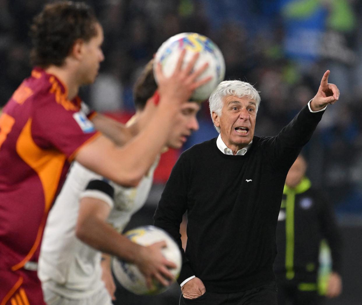 4月10日,罗马队主教练加斯佩里尼(右)在场边指挥。新华社发(阿尔贝托·林格利亚摄)