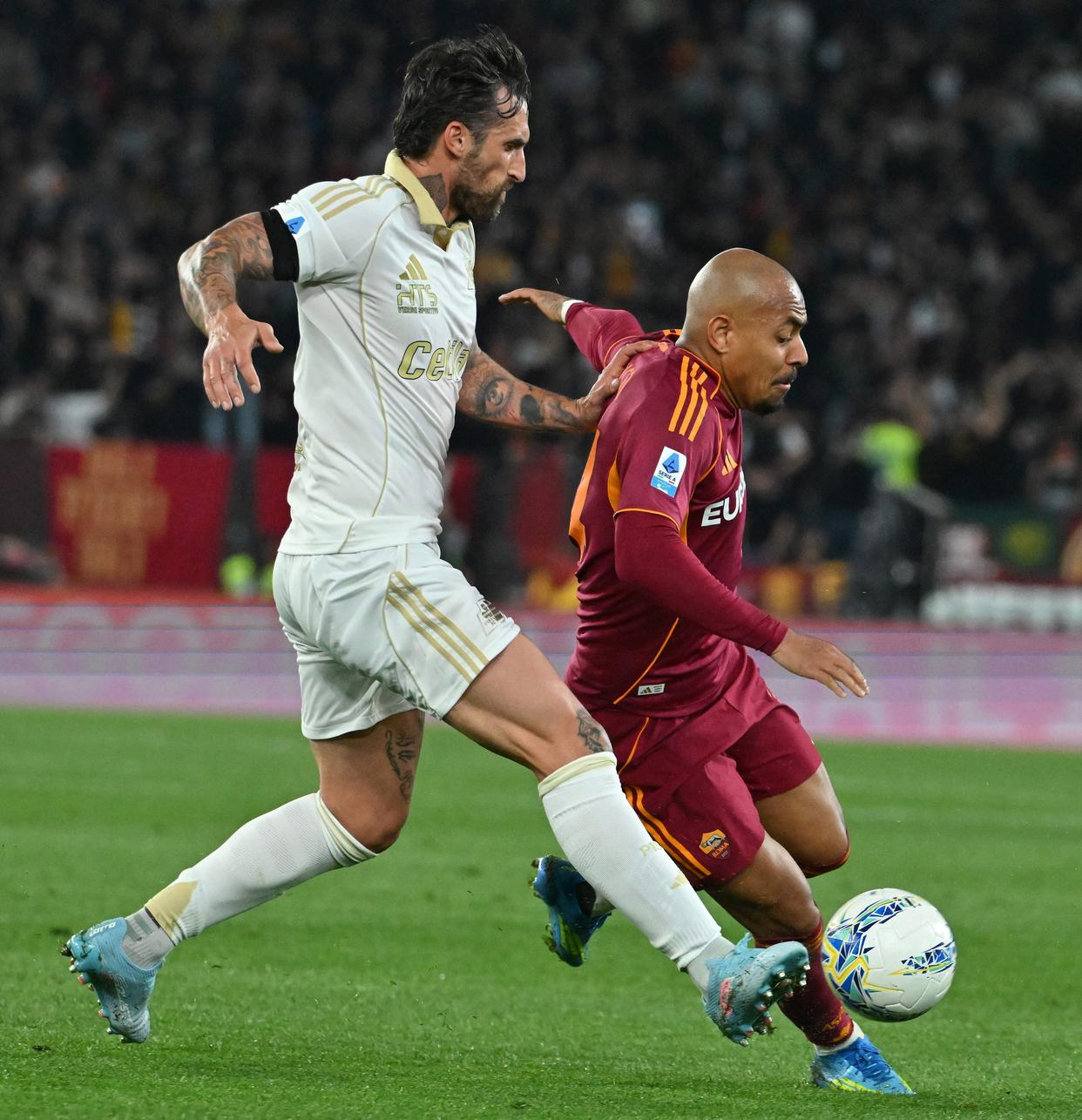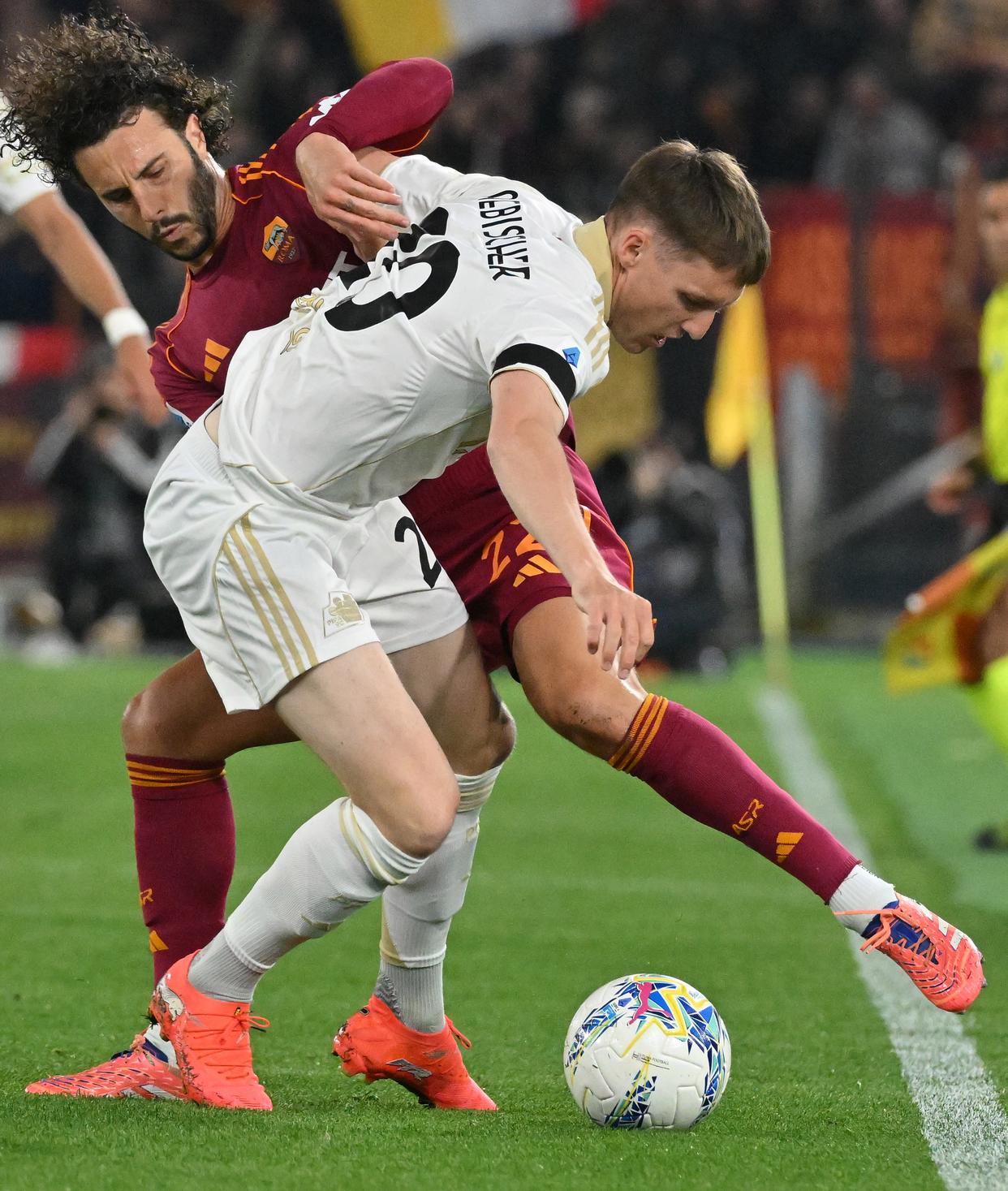 4月10日,罗马队球员马伦(右)与比萨队球员卡拉乔洛在比赛中拼抢。新华社发(阿尔贝托·林格利亚摄)