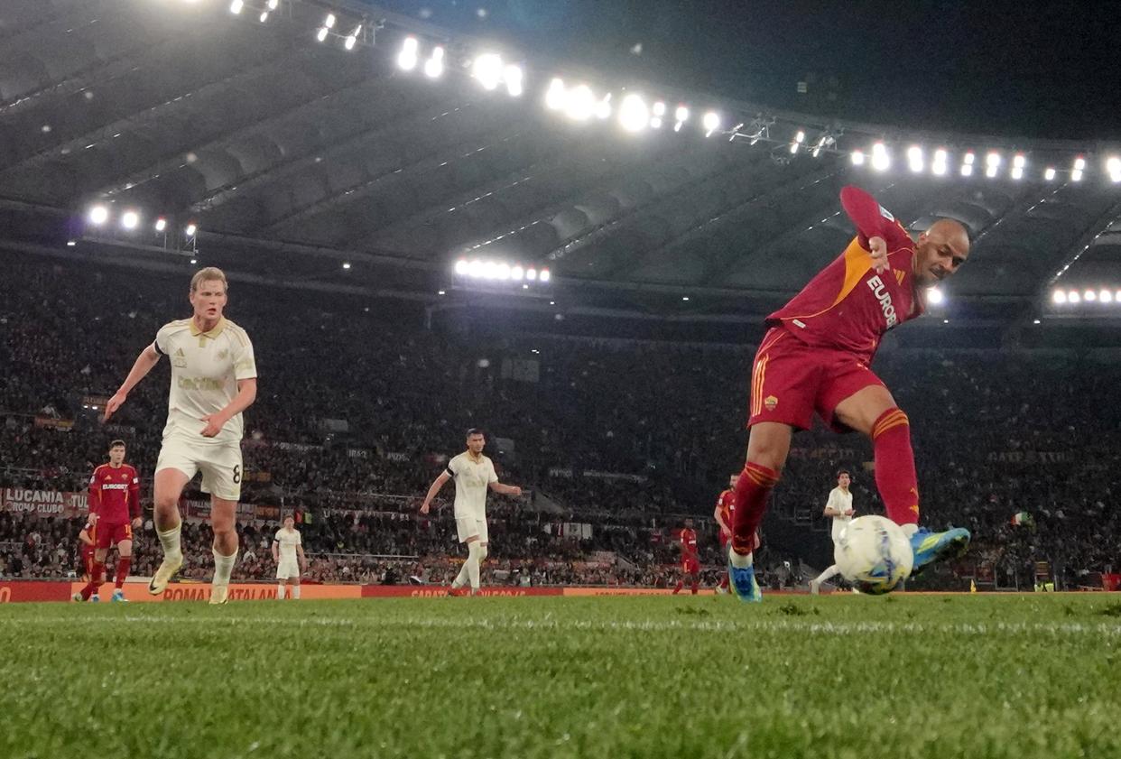 4月10日,罗马队球员马伦(右一)在比赛中攻入自己本场第二粒进球。新华社发(阿尔贝托·林格利亚摄)