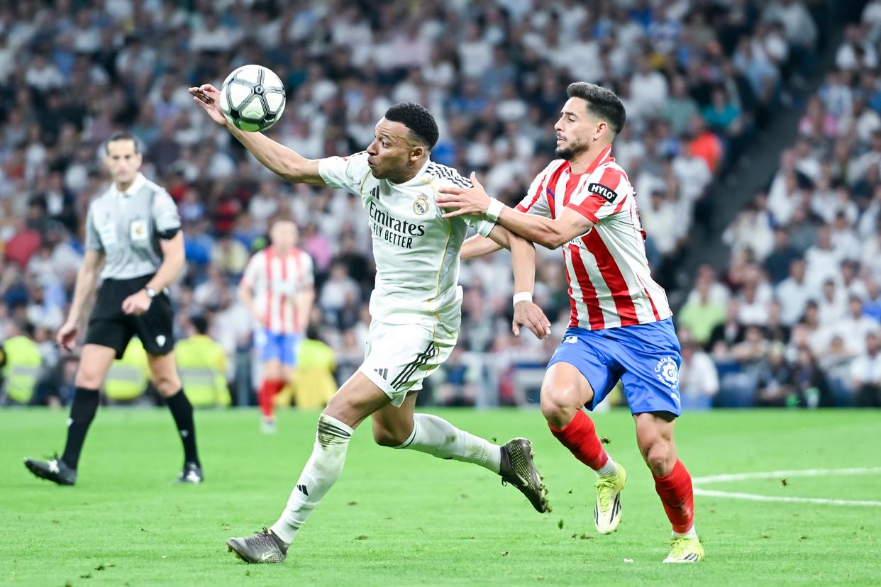 4月10日,皇家马德里队球员姆巴佩(左)和赫罗纳队球员莫雷诺争抢。新华社发(古斯塔沃·巴连特摄)