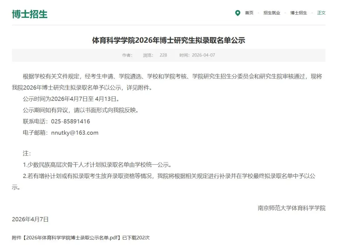 近日,南京师范大学体育科学学院发布2026年博士研究生拟录取名单公示,钱天一拟被录取。