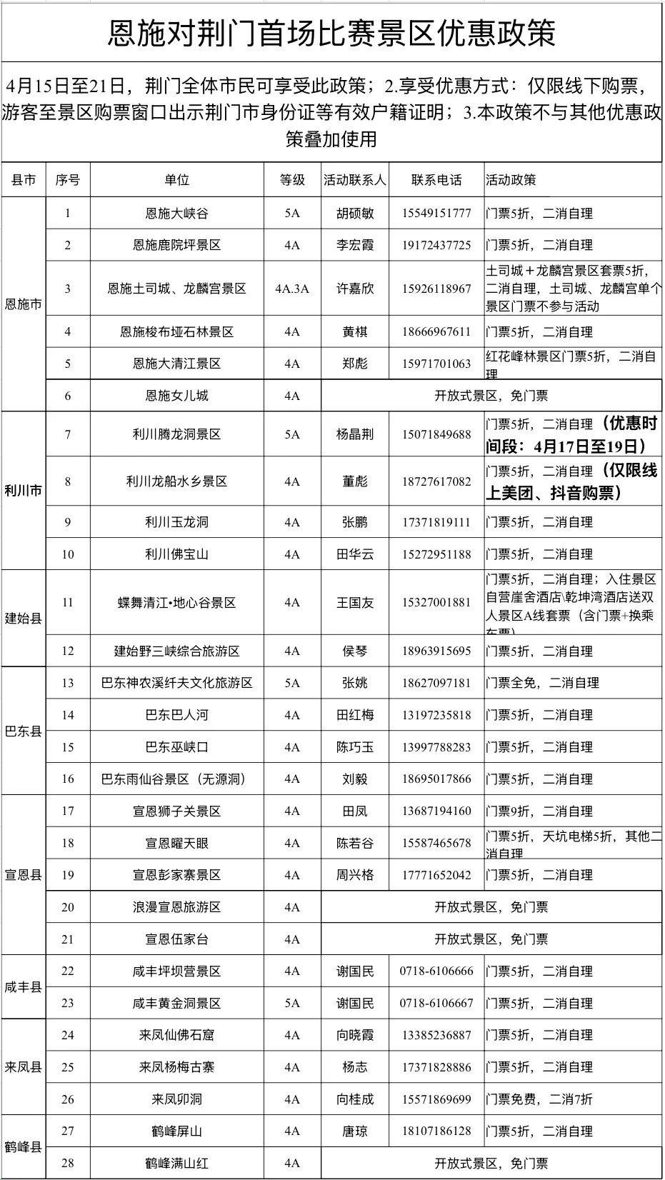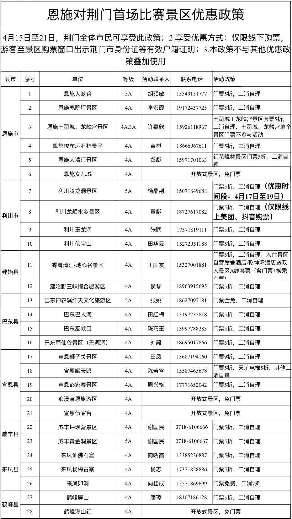 借着与楚超相遇的契机,恩施州28家A级景区面向荆门全体市民,专属推出了一系列优惠政策,邀荆门市民赴一场“看球+赏景”的双重盛宴。