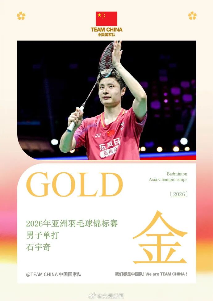 4月12日,在刚刚结束的2026年亚洲羽毛球锦标赛男单决赛中,中国选手石宇奇2:0战胜印度选手阿尤什·谢蒂,首次夺得该项赛事冠军。 恭喜!
