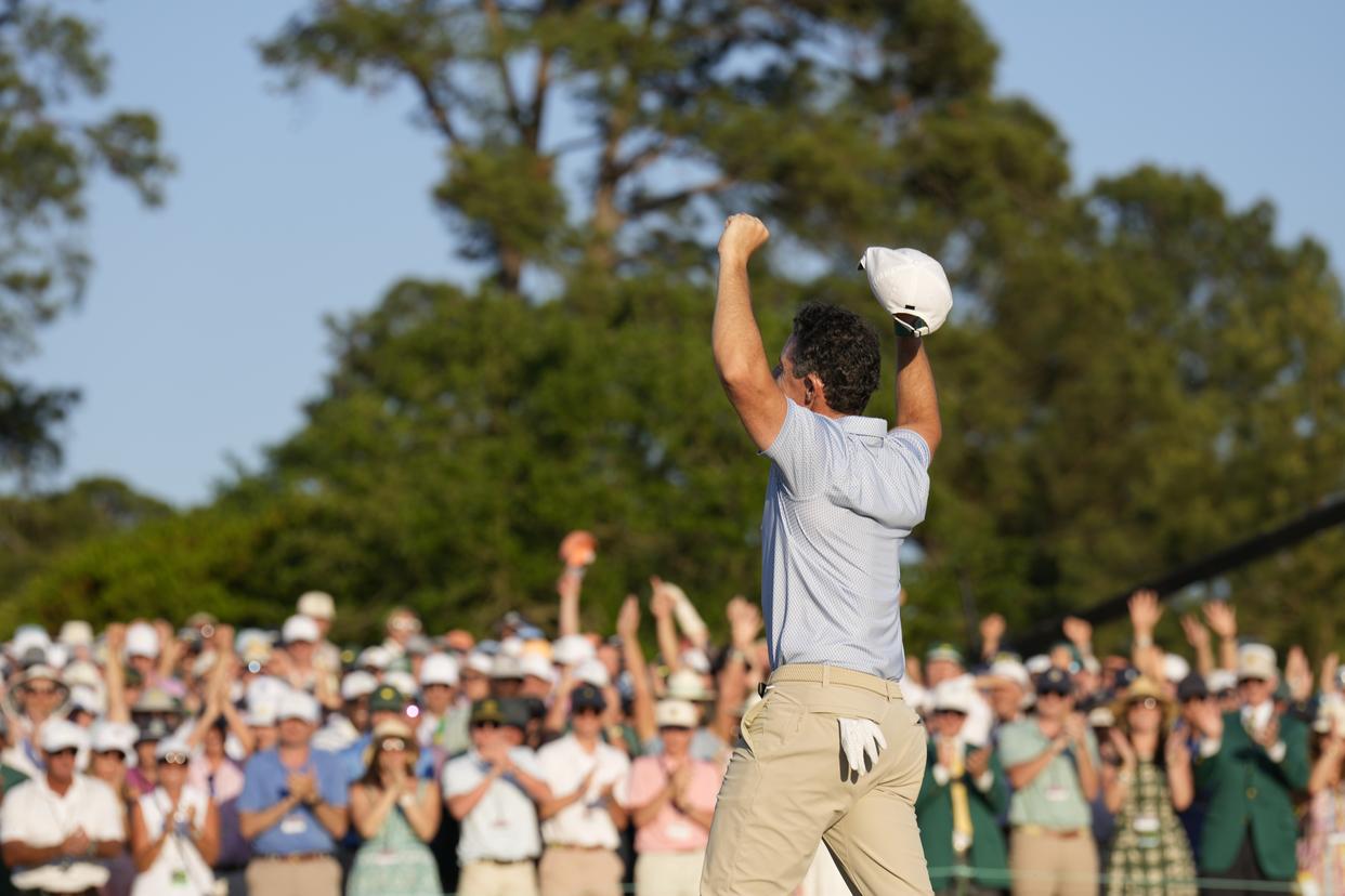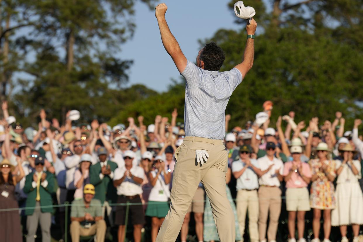 4月12日,北爱尔兰选手麦克罗伊在第四轮比赛后庆祝夺冠。新华社记者 吴晓凌 摄