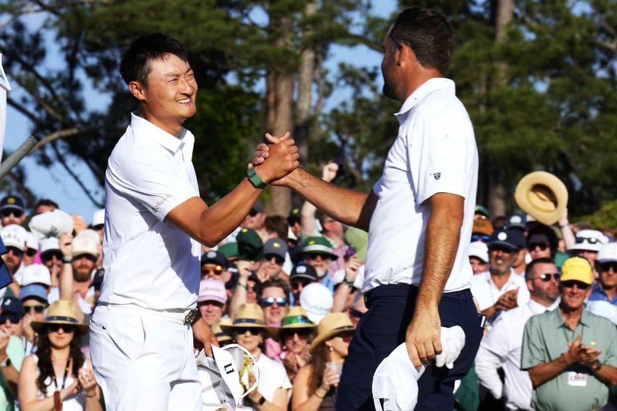 4月12日,中国选手李昊桐(左)在第四轮比赛结束后与同组的美国选手舍夫勒握手致意。最终,舍夫勒以四轮277杆的总成绩获得亚军,李昊桐以四轮289杆的总成绩获得并列第38名。新华社记者 吴晓凌 摄