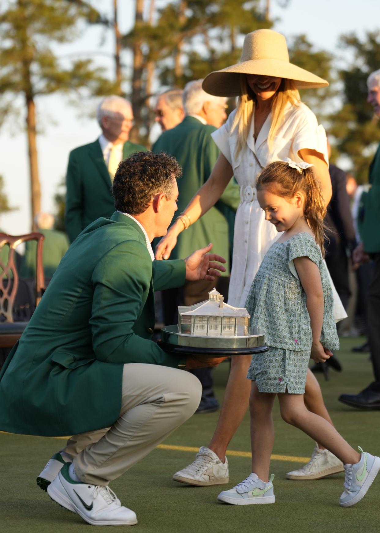 4月12日,北爱尔兰选手麦克罗伊在颁奖仪式上与家人一同庆祝。新华社记者 吴晓凌 摄