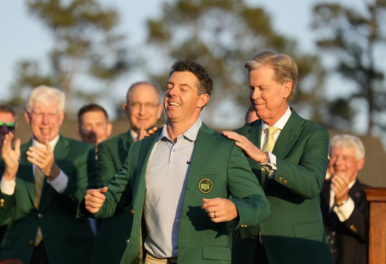 4月12日,奥古斯塔国家高尔夫俱乐部主席弗雷德·里德利(右)为卫冕冠军、北爱尔兰选手麦克罗伊穿上象征冠军的绿夹克。新华社记者 吴晓凌 摄