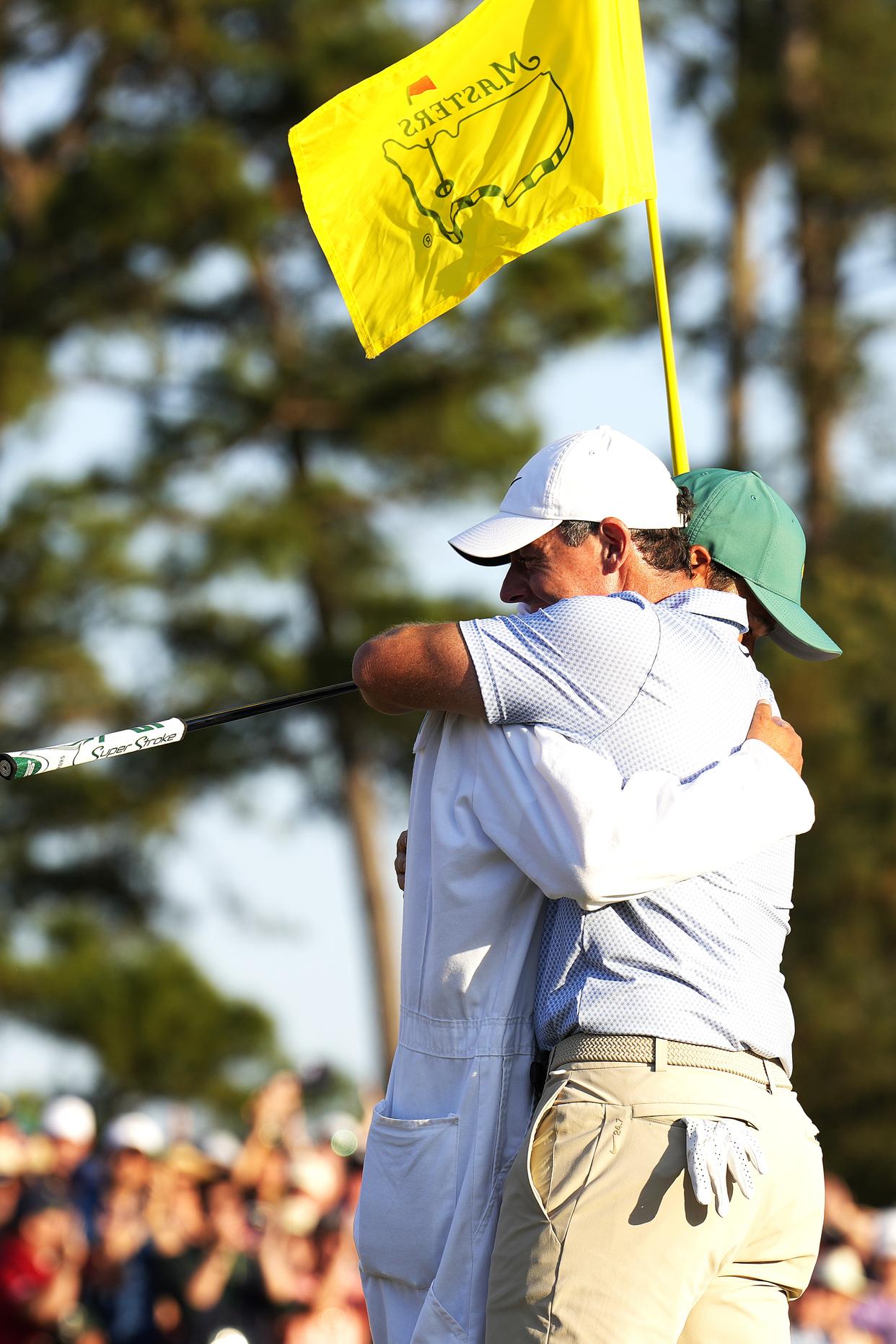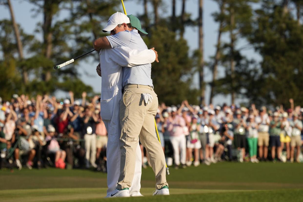 4月12日,北爱尔兰选手麦克罗伊(右)在第四轮比赛后庆祝夺冠。新华社记者 吴晓凌 摄