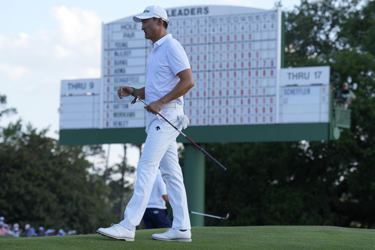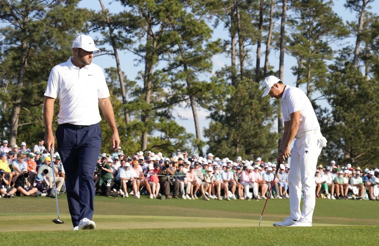 4月12日,中国选手李昊桐(右)与同组的美国选手舍夫勒在第四轮比赛中。最终,舍夫勒以四轮277杆的总成绩获得亚军,李昊桐以四轮289杆的总成绩获得并列第38名。新华社记者 吴晓凌 摄