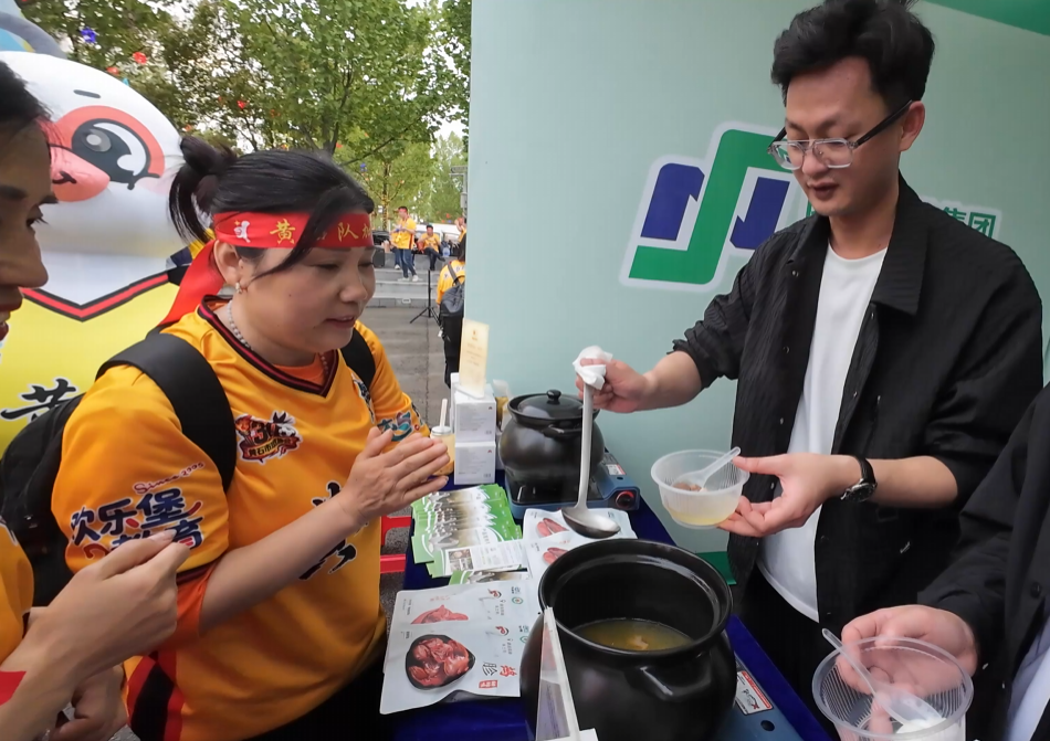 赛场内激情如火,场外同样人头攒动、热闹非凡。阳新农发公司精心设立的富川红茶和阳新屯鸟汤展位前,吸引了大批球迷和游客驻足品尝。富川红茶作为阳新县茶叶区域公用品牌,在省内外多次斩获金奖,香气馥郁、口感醇厚,深受茶客喜爱。而阳新屯鸟汤则更是一绝——似鹅非鹅、似鸭非鸭的阳新屯鸟是阳新独有的番鸭品种,小火慢炖数小时,汤色清亮、味浓香醇,被本地人亲切地称作“会飞的牛肉”。看一场精彩的球赛,喝一碗醇厚的富川红茶,再品一盅鲜美的屯鸟汤,阳新球迷和游客们在黄石奥体中心收获了一场“味觉与视觉双重盛宴”。