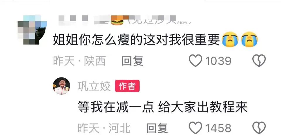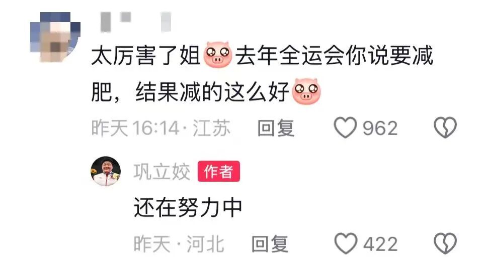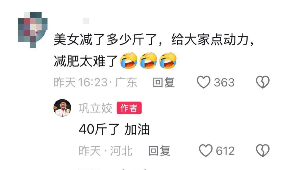 视频中巩立姣晒出两段视频,目前的她较之前瘦了不少,很多网友直呼认不出来,巩立姣在评论区回应称:已经瘦了40斤,加油。