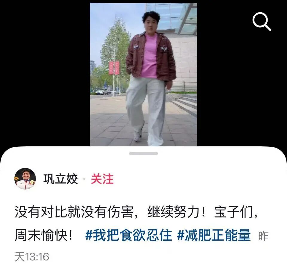4月12日,奥运冠军巩立姣更新社交媒体并配文:没有对比就没有伤害,继续努力,宝子们,周末愉快。