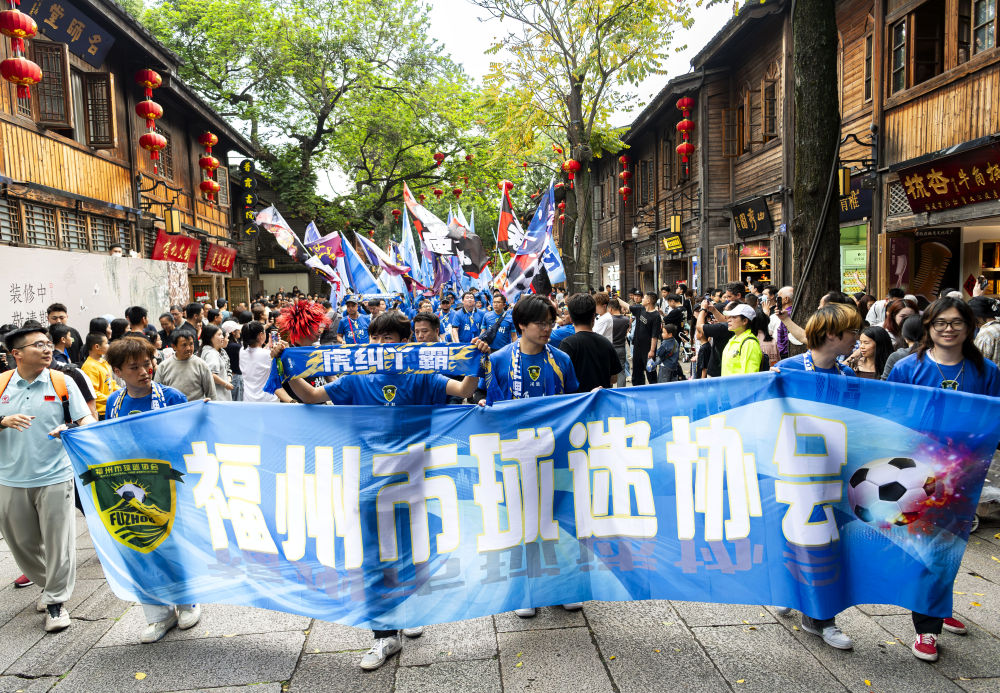 4月11日,“闽超”福州队球迷在福州市三坊七巷历史文化街区活动。新华社记者 魏培全 摄