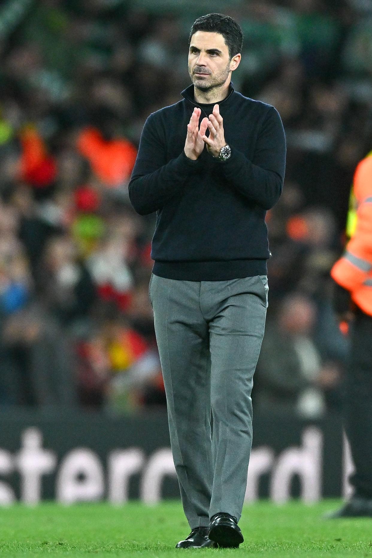 4月15日,阿森纳队主教练阿尔特塔赛后向球迷致意。新华社发