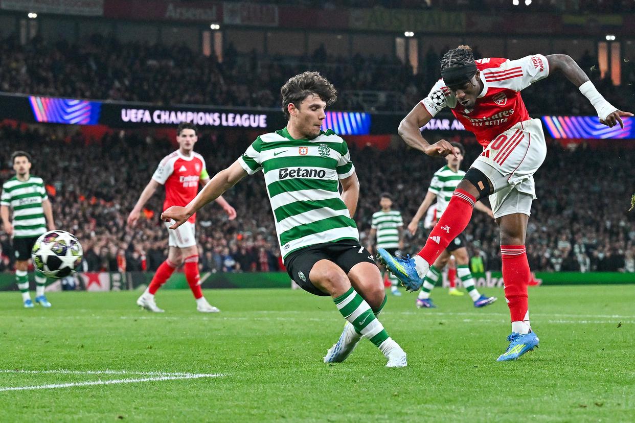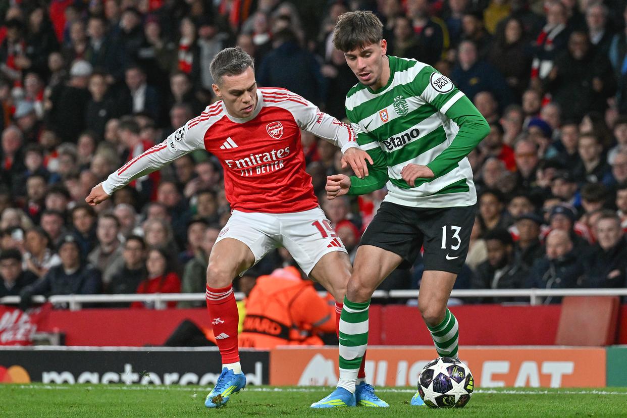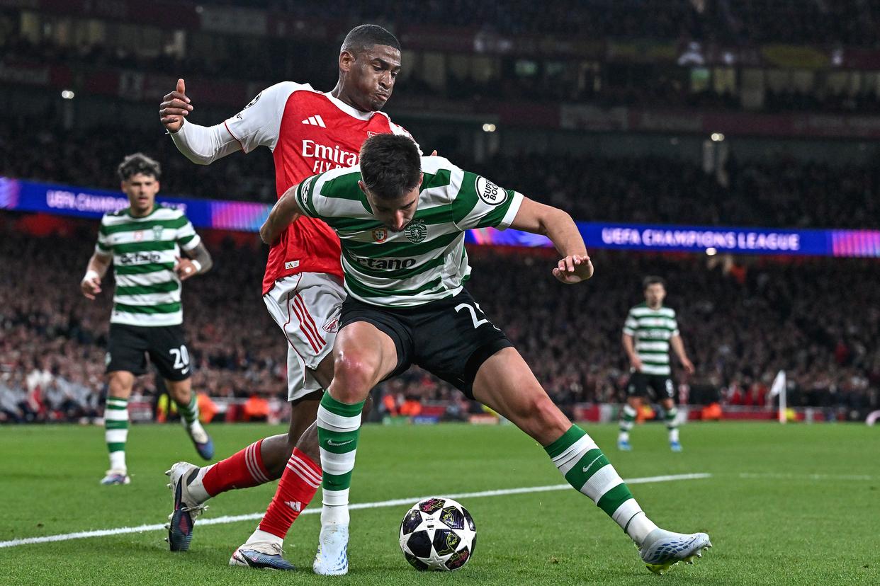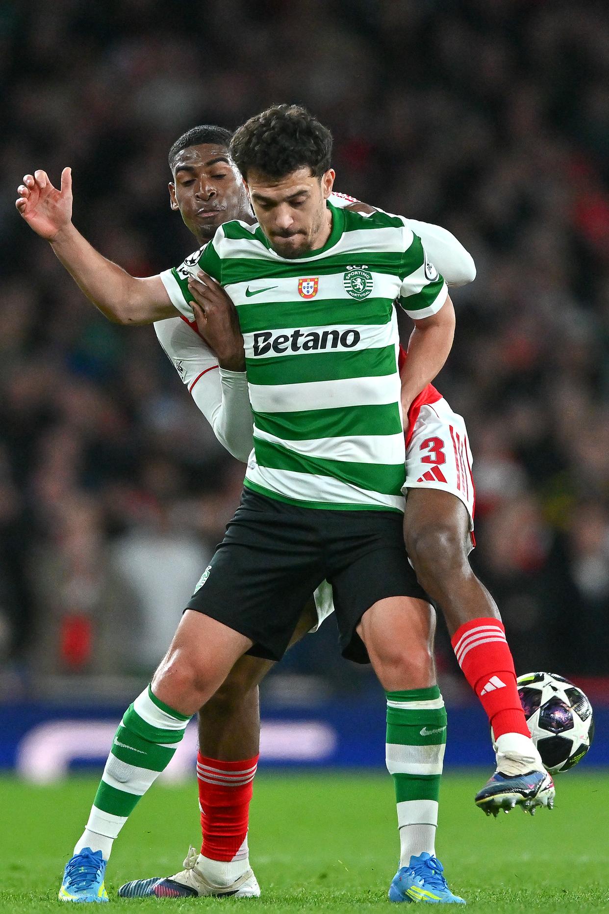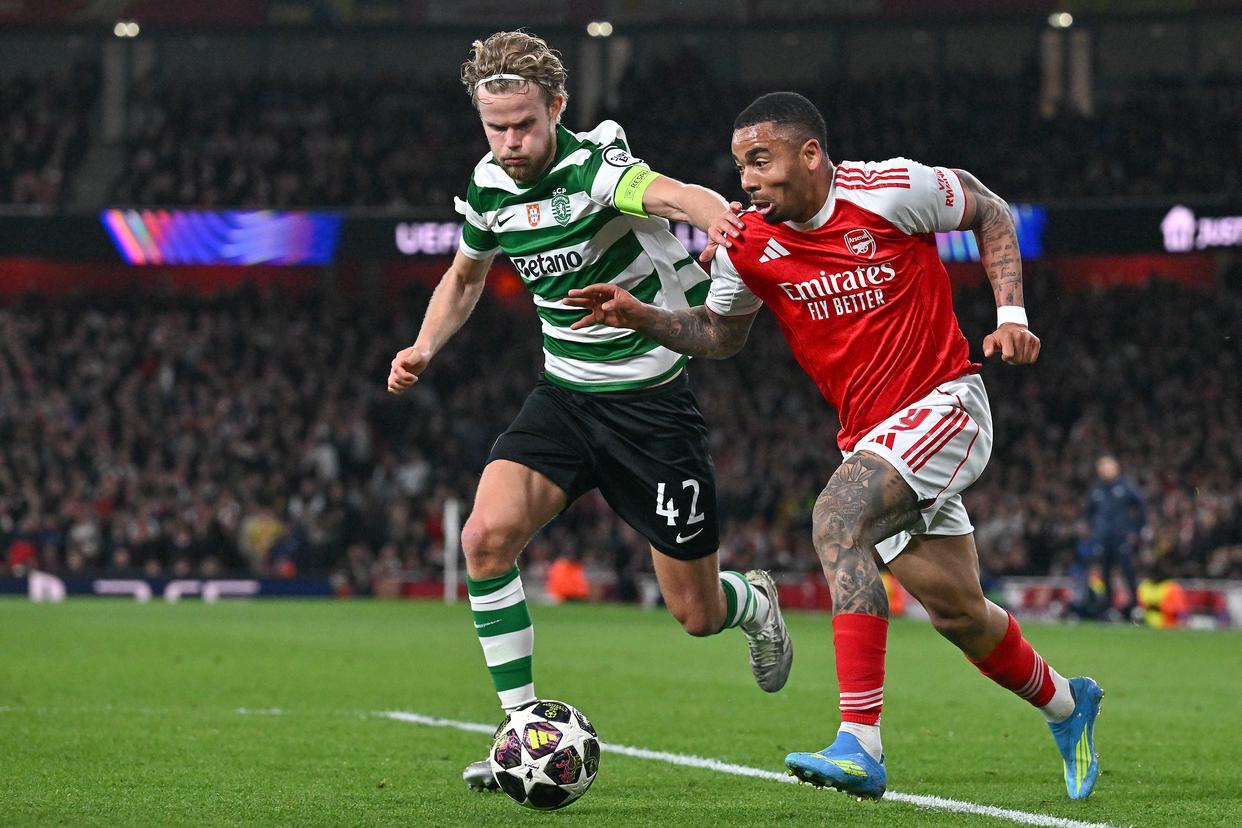 4月15日,阿森纳队球员热苏斯(右)与葡萄牙体育队球员尤尔曼拼抢。新华社发