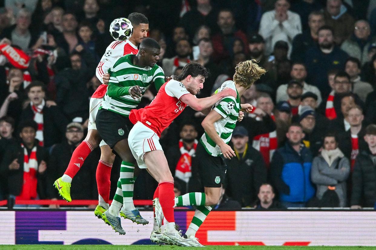 4月15日,阿森纳队球员赖斯(右二)、萨利巴(左一)与葡萄牙体育队球员特林康(右一)、迪奥曼德争顶。新华社发