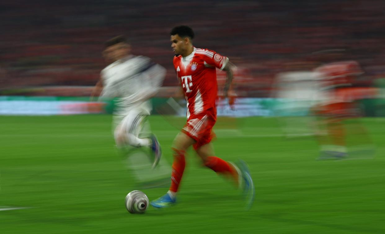 4月15日,拜仁慕尼黑队球员迪亚斯(前)在比赛中带球突破。新华社/路透