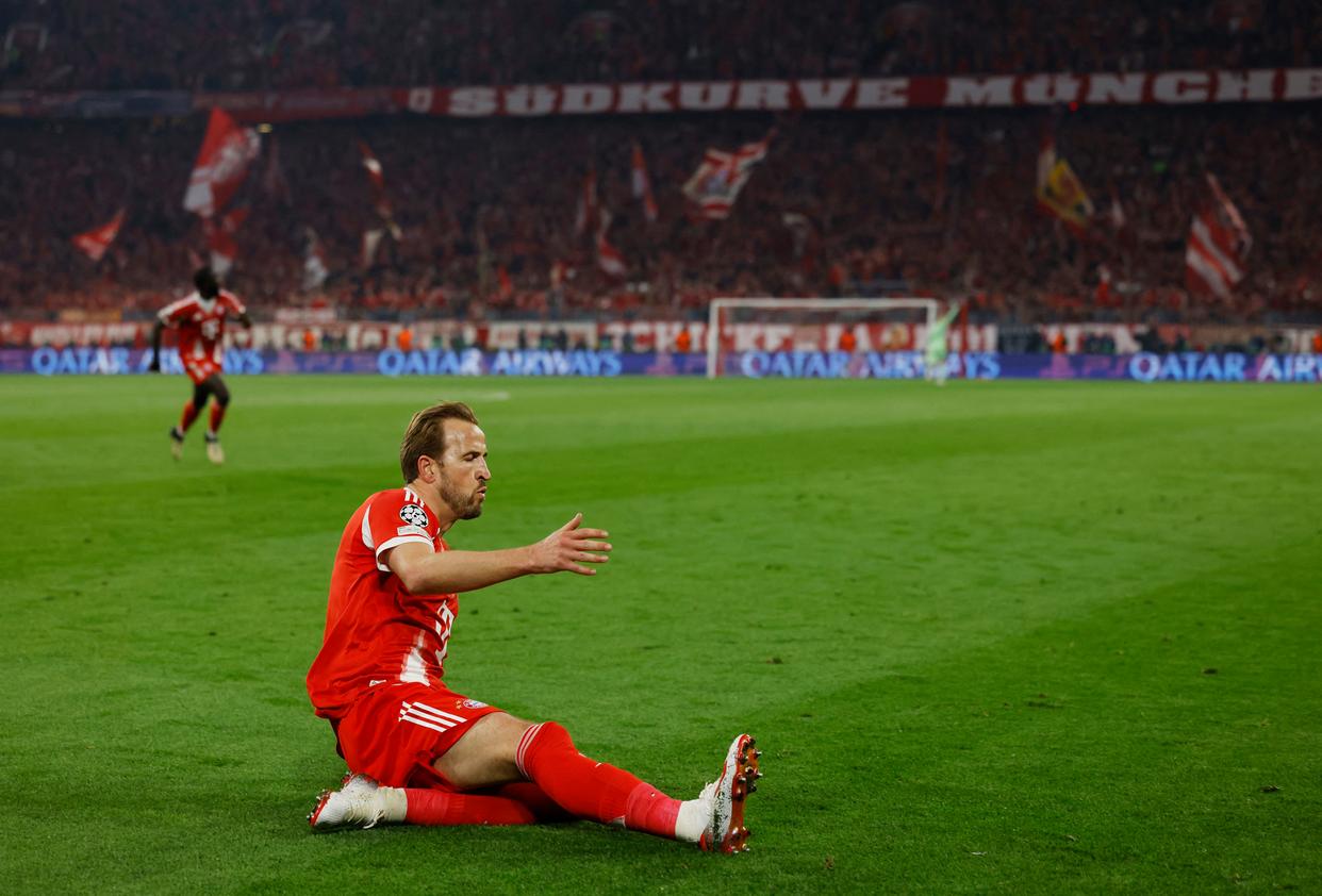 4月15日,拜仁慕尼黑队球员凯恩在比赛中庆祝进球。新华社/路透