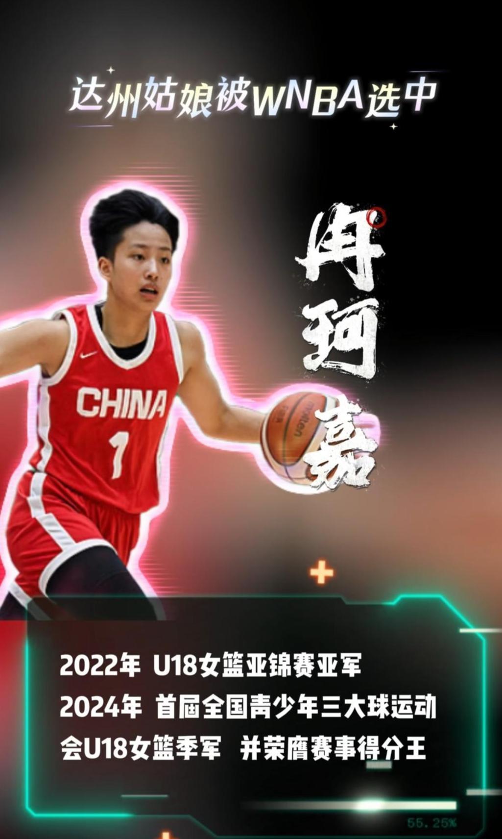 冉珂嘉,2006年9月29日出生,身高1.81米,四川达州人。据“达州发布”公开信息,她曾荣获众多比赛荣誉:2022年,U18女篮亚锦赛亚军;2024年,首届全国青少年三大球运动会U18女篮季军,并荣膺赛事得分王;2025年,代表中国女篮参加U19女篮世界杯,场均贡献19.1分和11.3个篮板,成为赛会篮板王;同年,夺得第十五届运动会U22女篮冠军。