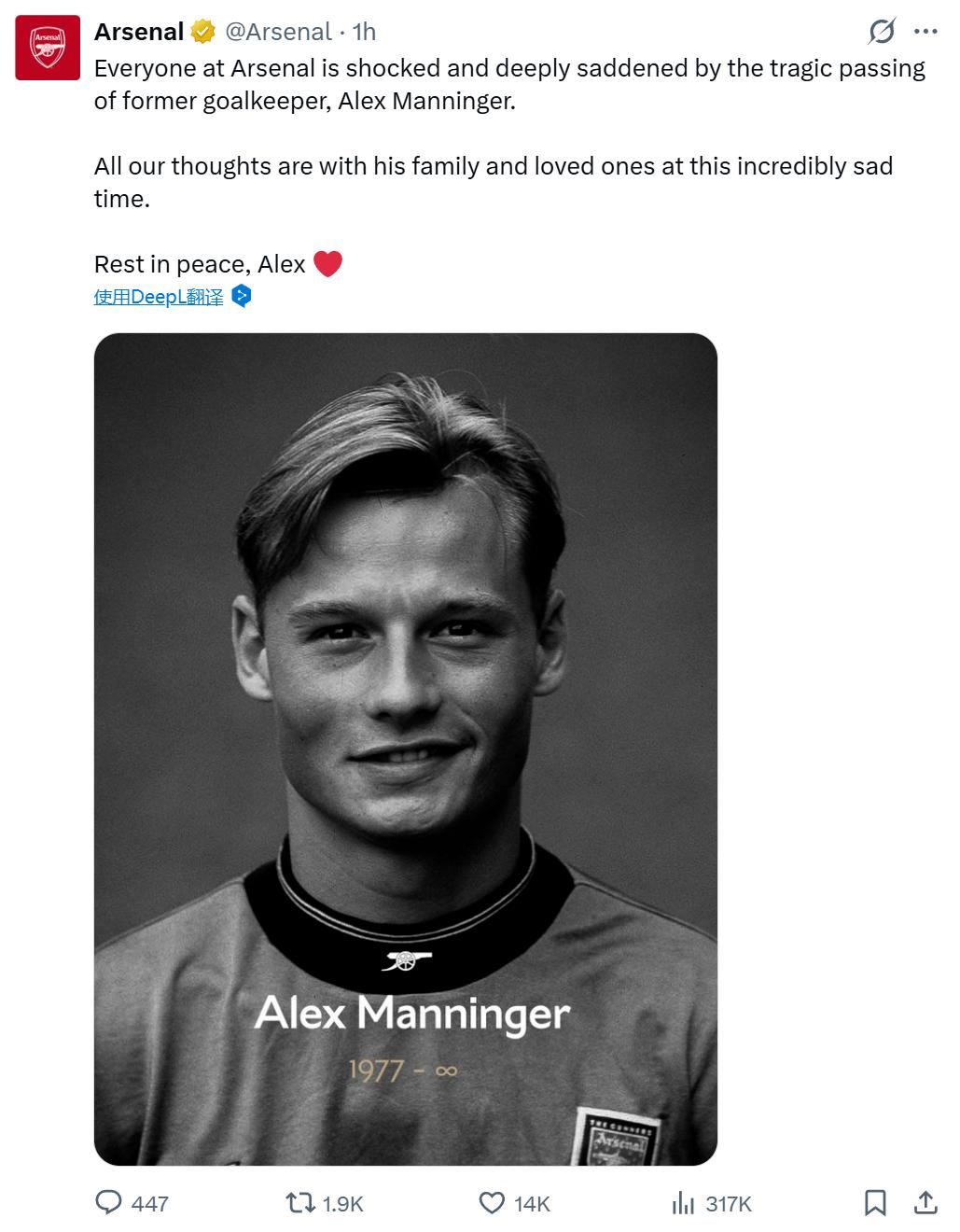 阿森纳、尤文图斯等俱乐部官方社交媒体也相继发文,深切悼念昔日门将亚历山大·曼宁格的离世。