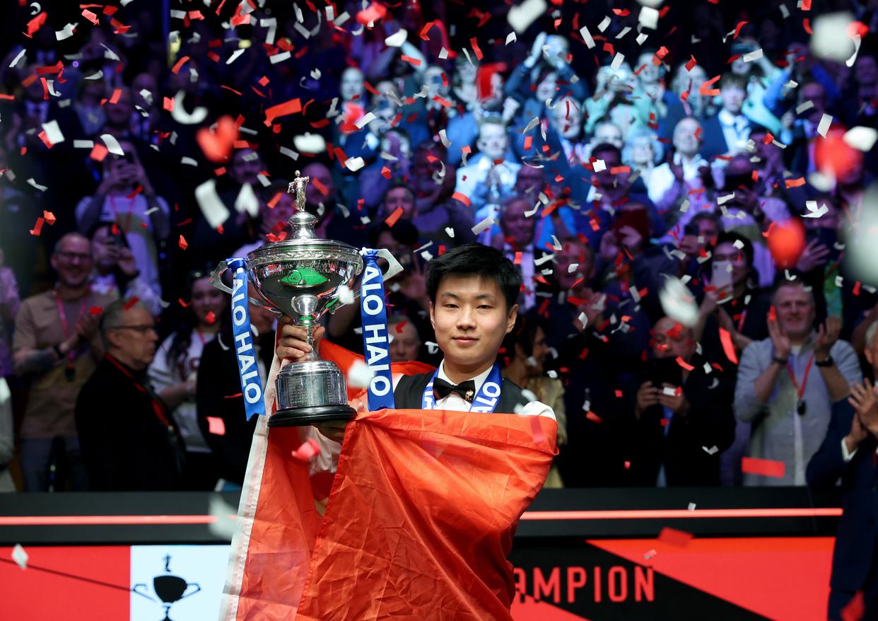 2025年5月5日,赵心童在2025年斯诺克世锦赛决赛颁奖仪式上。新华社发(翟政摄)这个赛季