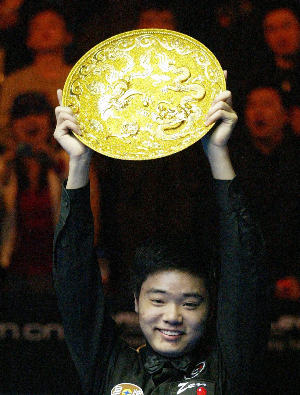 2005年4月3日,中国选手丁俊晖手握奖盘向观众示意。当日,在北京进行的斯诺克中国公开赛决赛中,丁俊晖战胜亨德利,夺得冠军。 新华社记者毕明明摄中国球迷为之兴奋的另一个理由