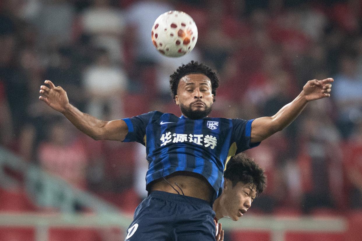 4月17日,武汉三镇队球员贝维斯(前)在比赛中与成都蓉城队球员贺一然争顶。新华社记者 肖艺九 摄