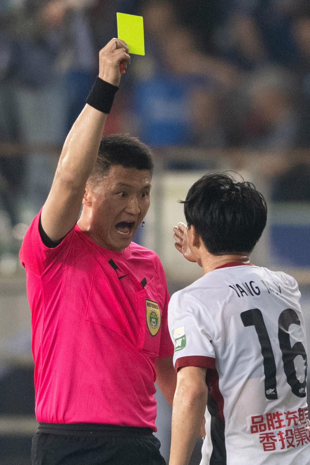 4月17日,成都蓉城队球员杨明洋(右)在比赛中被黄牌警告。新华社记者 肖艺九 摄