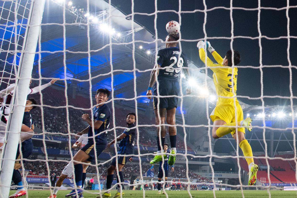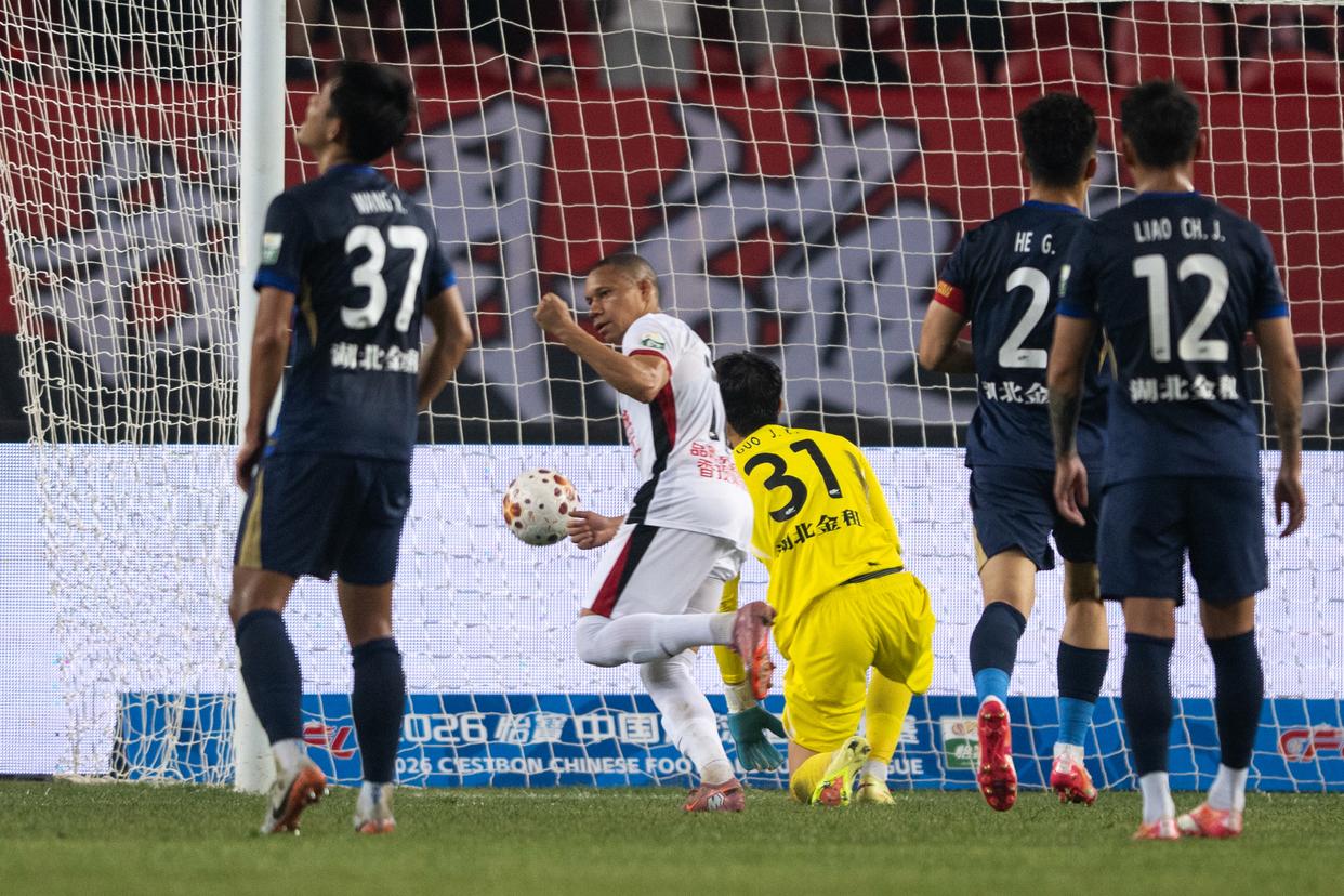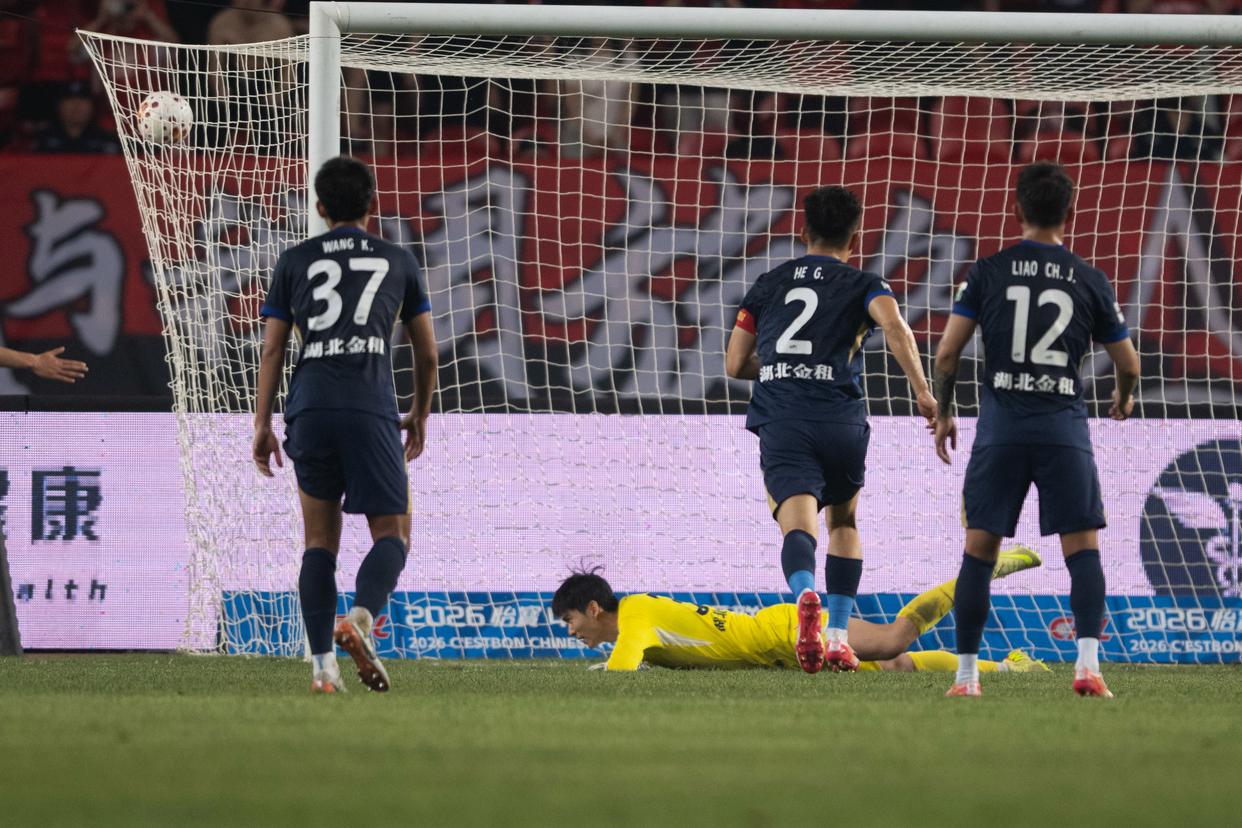 4月17日,武汉三镇队守门员郭嘉宇(左三)在比赛中扑救失利。新华社记者 肖艺九 摄