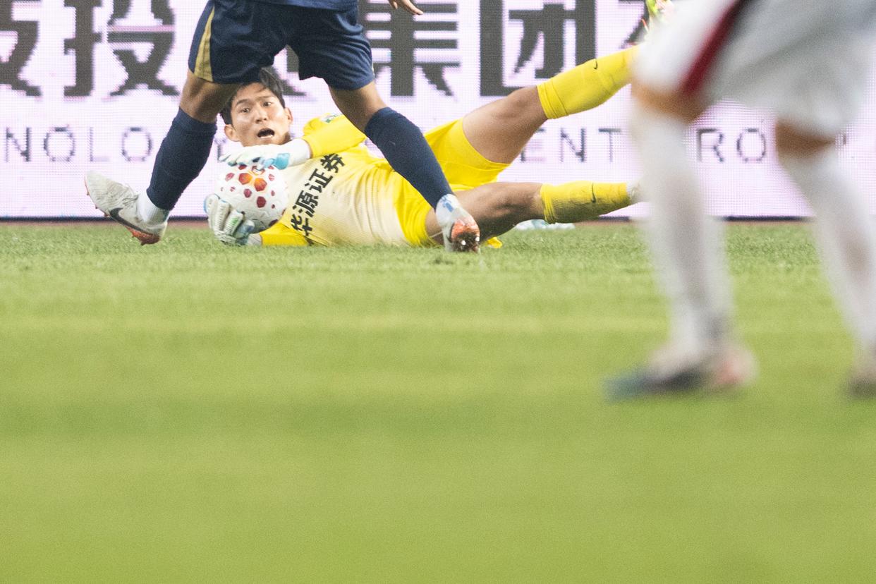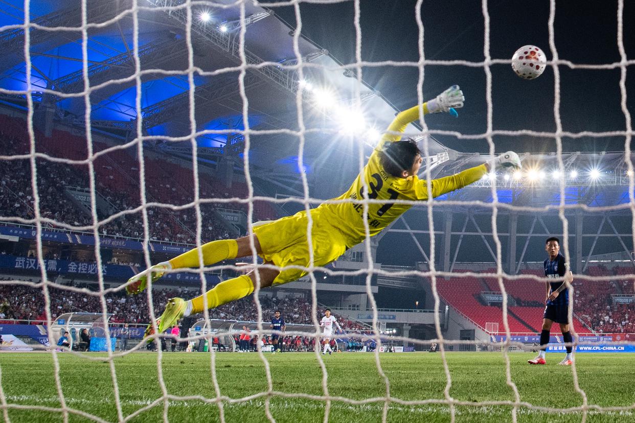 4月17日,武汉三镇队守门员郭嘉宇(右一)在比赛中扑救。新华社记者 肖艺九 摄