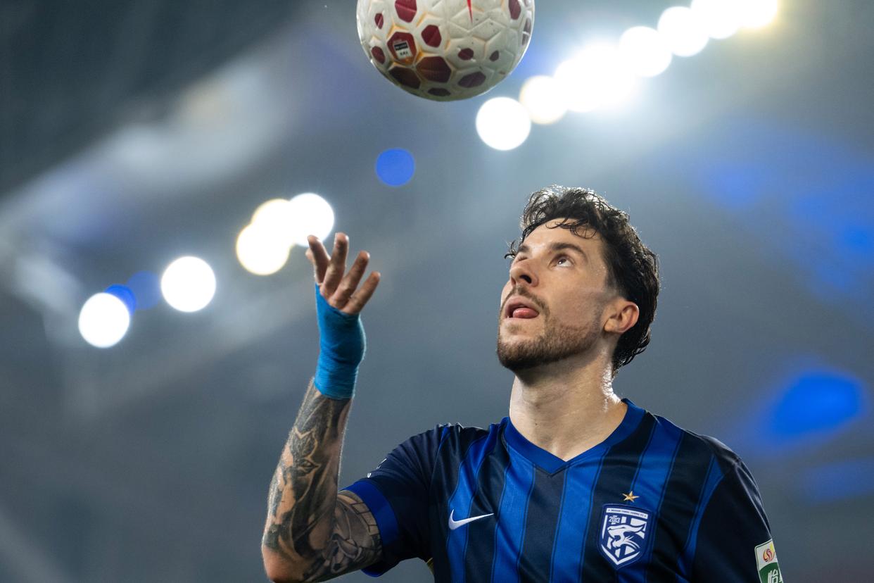 4月17日,武汉三镇队球员绍尔在比赛中准备发角球。新华社记者 肖艺九 摄