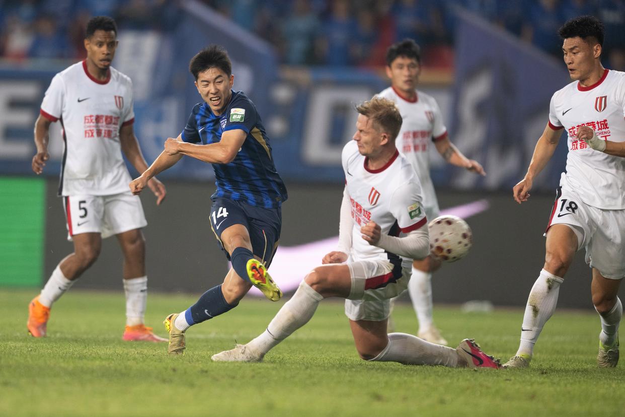 4月17日,武汉三镇队球员夏晓曦(左二)在比赛中射门。新华社记者 肖艺九 摄
