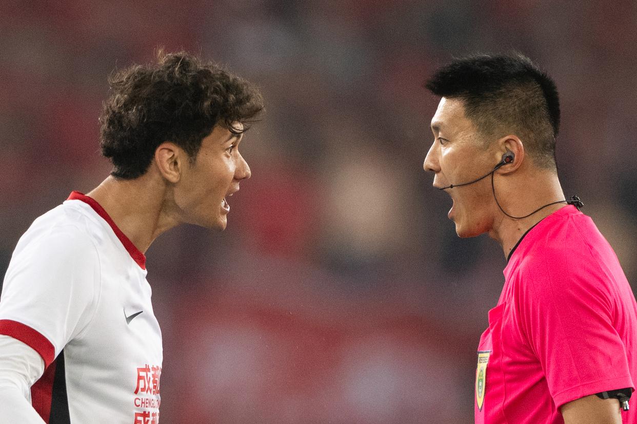 4月17日,成都蓉城队球员拜合拉木·阿卜杜外力(左)在比赛中与裁判争论。 新华社记者 肖艺九 摄